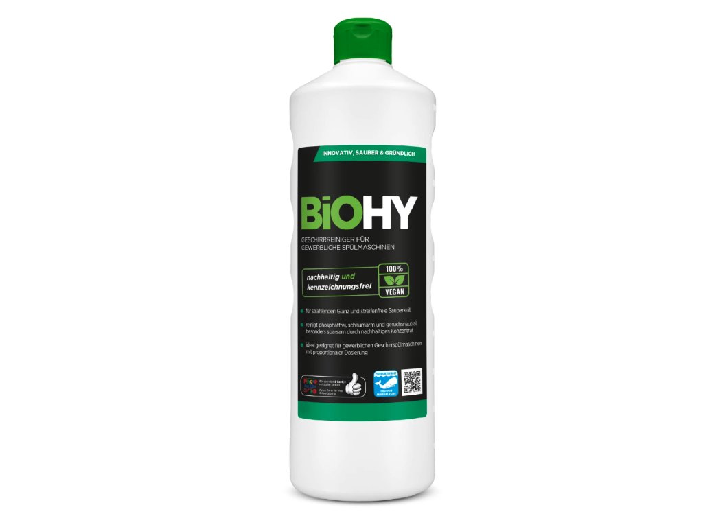 BiOHY mycí prostředek na nádobí je 1litrový tekutý koncentrát určený pro profesionální myčky nádobí s proporcionálním dávkováním. Zajišťuje zářivý lesk a čistotu bez šmouh, je vysoce ekonomický, bez fosfátů, s nízkou pěnivostí a bez zápachu. Je vhodný pro použití v gastronomii, hotelech, soukromých kuchyních a mateřských školách, kde efektivně čistí skleněné, plastové a nerezové nádobí.