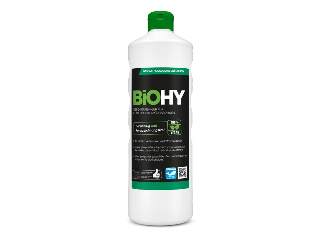 BiOHY mycí prostředek na nádobí v 1litrové lahvi je vysoce koncentrovaný tekutý čistič pro profesionální myčky nádobí s proporcionálním dávkováním. Zajišťuje zářivý lesk bez šmouh, je bez fosfátů, má nízkou pěnivost a je bez zápachu. Je ideální pro gastronomii, hotely, soukromé kuchyně a mateřské školy.