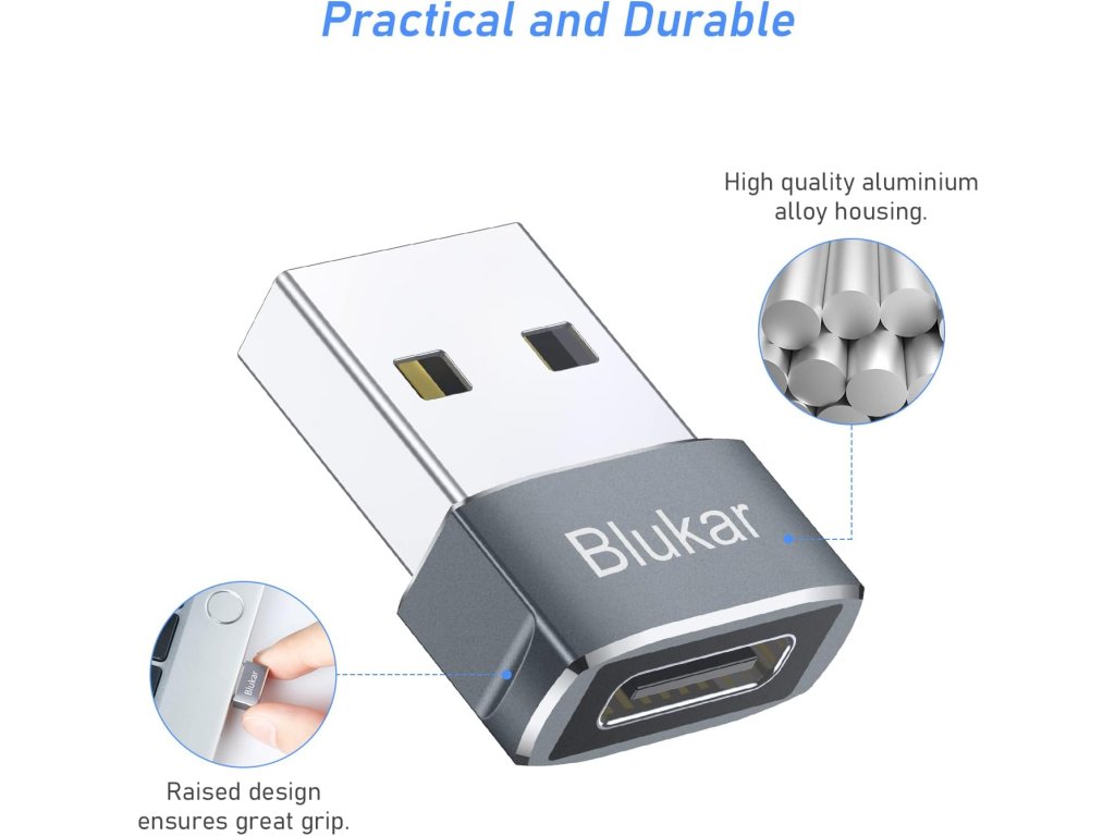 Balení 3 adaptérů Blukar USB na Type C (USB-C samice na USB-A samec) pro nabíjení a přenos dat. Kompatibilní s iPhone 16/15, Galaxy a dalšími smartphony/tablety.