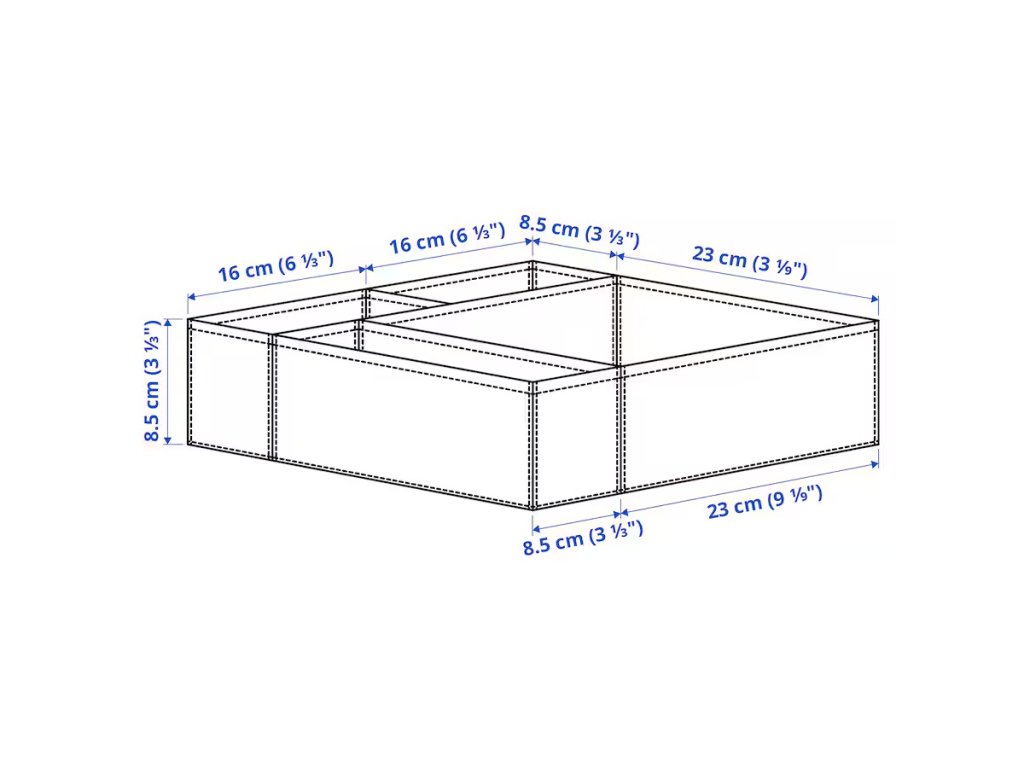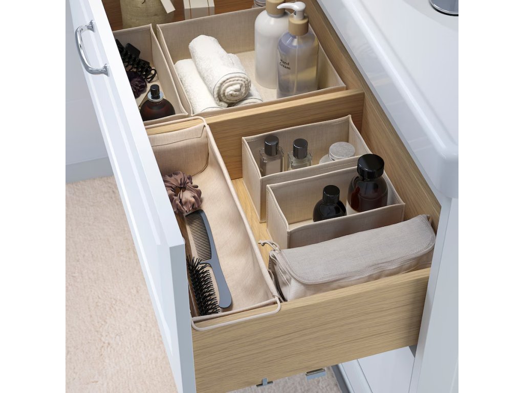 Udržujte pořádek ve svých zásuvkách s touto praktickou sadou 4 organizérů BOLLÖSUND v elegantní béžové barvě. Sada obsahuje krabice různých velikostí, které vám pomohou uspořádat šperky, líčidla a další drobné předměty, abyste je vždy snadno našli a ušetřili tak čas i místo. Organizéry lze snadno složit a uložit, když je zrovna nepotřebujete. Plastový vnitřek zajišťuje stabilitu a zároveň se snadno čistí – stačí jej otřít do sucha. S organizéry BOLLÖSUND bude vaše zásuvka vždy přehledná a uspořádaná.