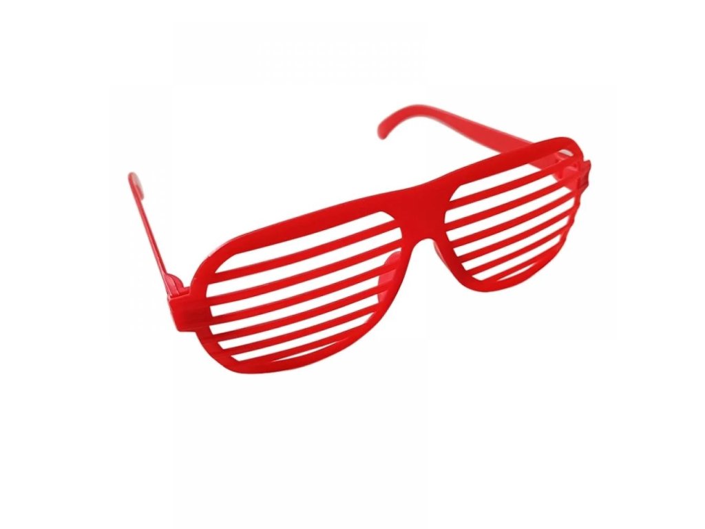 Bombom Tree brýle ve stylu závěrky, červené. Retro sluneční brýle z 80. let pro děti i dospělé. Ideální jako party doplněk nebo rekvizita. Fotografie je ilustrační, barvy se mohou lišit.