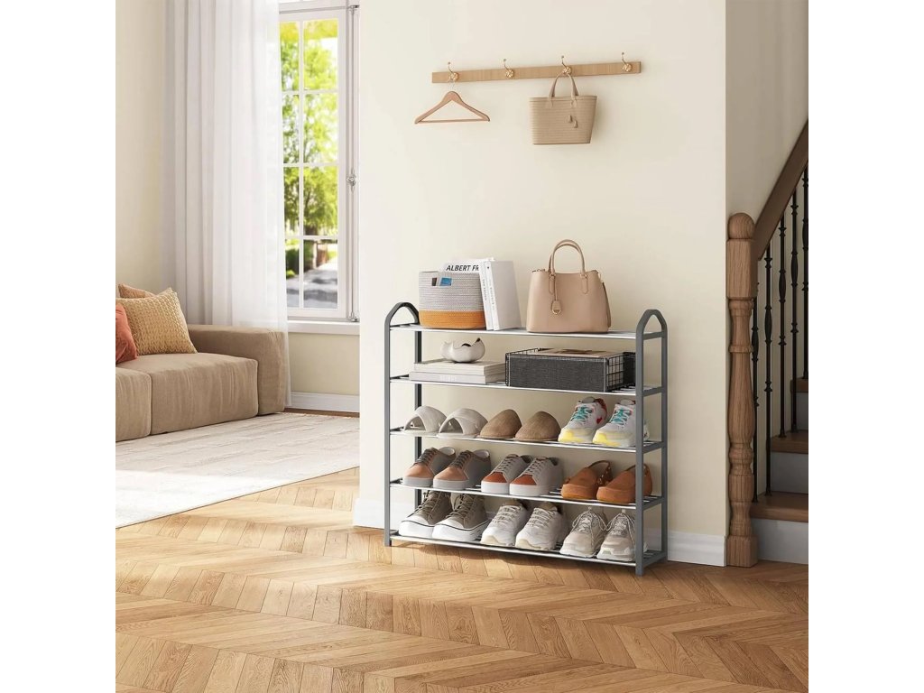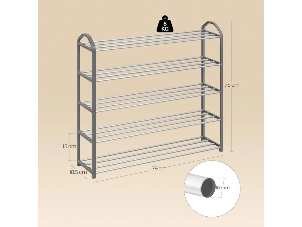 Tento botník je vyroben z kompozitních oceloplastových trubek a PP plastu, díky čemuž je vodoodpudivý a odolný proti korozi. Horní část rámu je zakřivena do rukojetí pro snadné přenášení. Každá z pěti polic má výšku 17 cm, ale lze je i jednotlivě odebrat, aby se do botníku vešly vyšší boty nebo jiné předměty. Spodní police je zvýšená, aby se zabránilo hromadění vlhkosti. Díky rozměrům 79 x 19,5 x 79 cm se hodí do jakéhokoli rohu místnosti. Montáž je rychlá a snadná bez nutnosti speciálního nářadí.