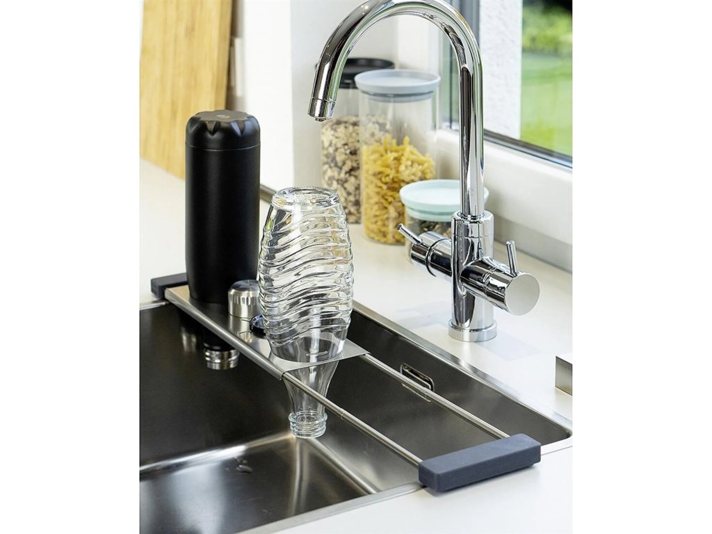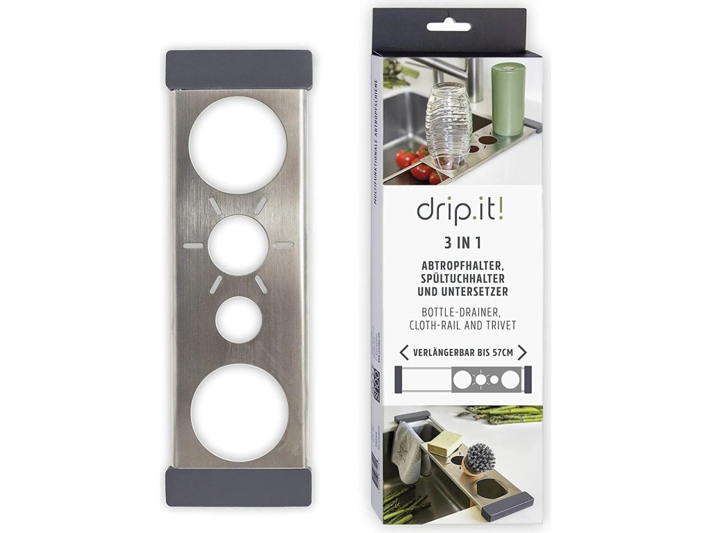 S multifunkčním odkapávačem BRAINSTREAM Drip.it vyřešíte problém s mokrými povrchy v kuchyni. Tento praktický držák je vyrobený z kvalitní nerezové oceli a lze jej plynule vysunout od 32,5 do 56,5 cm, takže se přizpůsobí téměř každému dřezu. Zajišťuje, že lahve odkapávají přímo do dřezu, čímž eliminuje potřebu odkapávacích podložek. Drip.it je univerzální a hodí se pro nejrůznější typy lahví, od kojeneckých přes skleněné až po moderní termo lahve, včetně značek jako SodaStream nebo Sigg. Kromě sušení lahví slouží také jako držák na utěrky, organizér na mycí potřeby nebo podložka pod horké nádobí. Je navržen ve Švýcarsku a lze jej mýt v myčce nádobí.