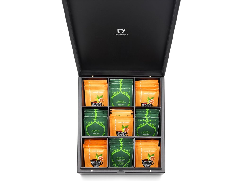 Udržujte své oblíbené čaje přehledně uspořádané a chráněné v elegantní čajové krabičce Bredemeijer. Tato praktická krabička je vybavena 9 flexibilními přihrádkami, jejichž velikost a uspořádání si můžete přizpůsobit podle velikosti vašich čajových sáčků, ať už jsou standardní, velké nebo uzavřené.
