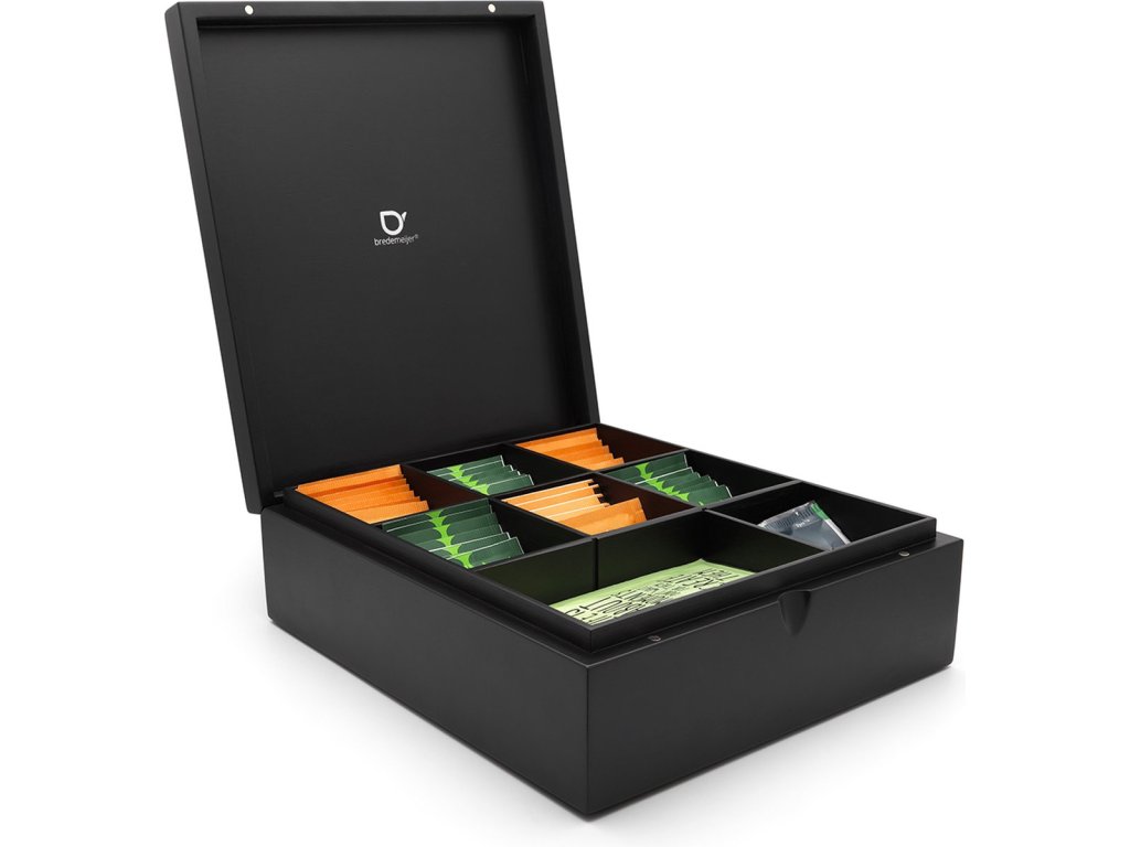 Bredemeijer čajová krabička s 9 flexibilními přihrádkami. Bambus, černá barva, uzavřené víko. Pro všechny velikosti čajových sáčků.