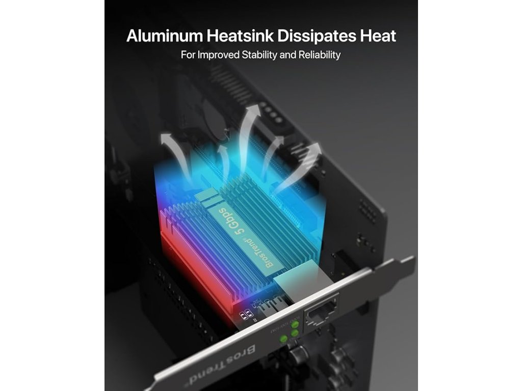Síťový adaptér BrosTrend představuje moderní řešení pro upgrade stolního počítače na standard 5GBASE-T. Díky podpoře rychlostí, které jsou pětinásobně vyšší než u běžných gigabitových karet, je toto zařízení ideální volbou pro uživatele vyžadující extrémní datovou propustnost a minimální latenci. Karta je postavena na kvalitním hliníkovém šasi s hustým žebrováním chladiče, které optimalizuje odvod tepla a zaručuje stabilní výkon i při maximálním zatížení v domácích serverech nebo herních stanicích.