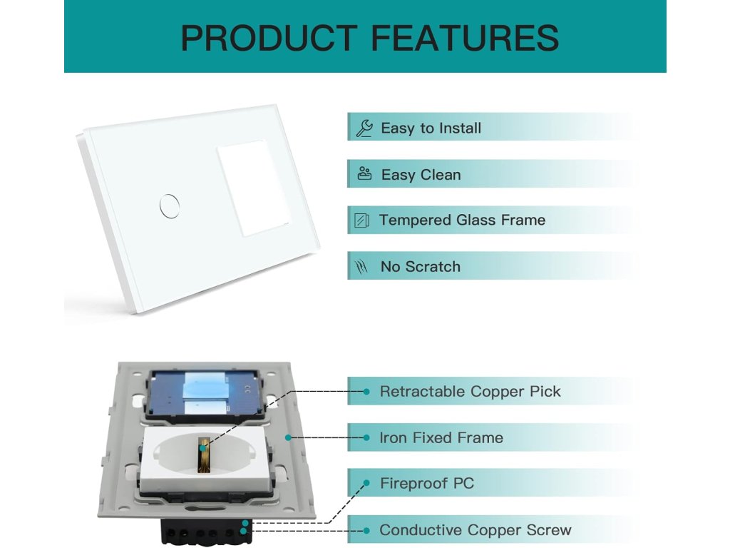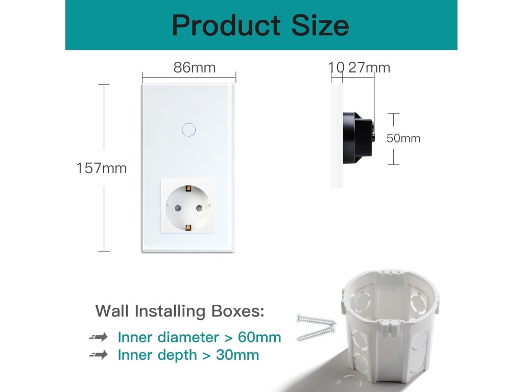 Sada obsahující standardní 16A EU zásuvku Schuko (BEZ WIFI) a 1cestný chytrý dotykový WiFi vypínač BSEED v bílé barvě. Vypínač je kompatibilní s hlasovým ovládáním Amazon Alexa a Google Home Assistant a umožňuje dálkové ovládání přes aplikaci Smart Life/Tuya. Funkce plánování a časovače pro automatizaci. Snadná instalace (vyžaduje neutrální vodič).