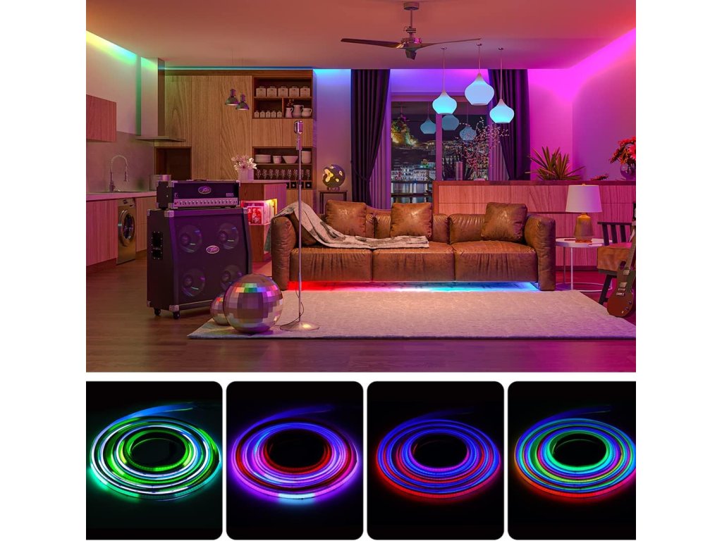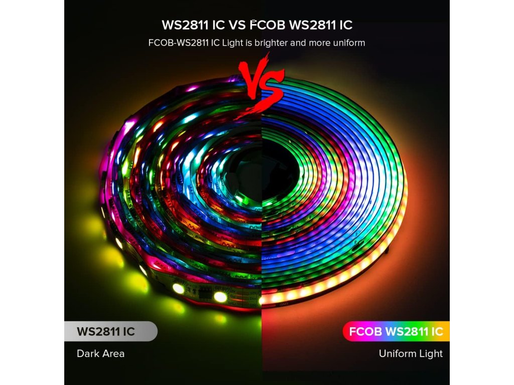 Adresovatelný FCOB RGB LED pásek BTF-LIGHTING o délce 3 metry. Napájení DC 24V, hustota 630 LED/m a 14 IC (WS2811) na metr (jeden IC řídí 45 LED). Kompatibilní s programovatelnými kontrolery (K1000C aj.), aplikacemi (SP630E aj.), hudebními kontrolery (CSY08 aj.) a smart WiFi hlasovým ovládáním (SP530E aj.) i DIY kontrolery. Technologie Flip-Chip-On-Board (FCOB) zajišťuje ultra jasné a rovnoměrné světlo bez tmavých míst. Nabízí úžasné světelné efekty s 16 miliony míchatelných barev. Pásek je flexibilní, stříhatelný (každých 71 mm) a snadno propojovatelný díky 3pinovým konektorům na obou koncích. Šířka pásku je 10 mm. Vysoce kvalitní dvouvrstvá měděná PCB pro lepší vodivost a odvod tepla s životností přes 65 000 hodin. Ideální pro vnitřní dekoraci (obývací pokoj, ložnice, kuchyň, osvětlení skříní, schodišť, zrcadel apod.). Dodává se se samolepicí zadní stranou a montážními klipy (napájecí adaptér a kontroler nejsou součástí balení).