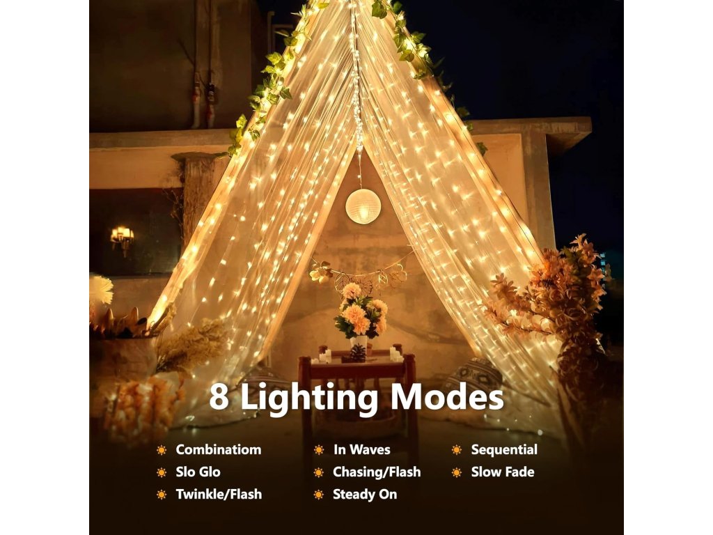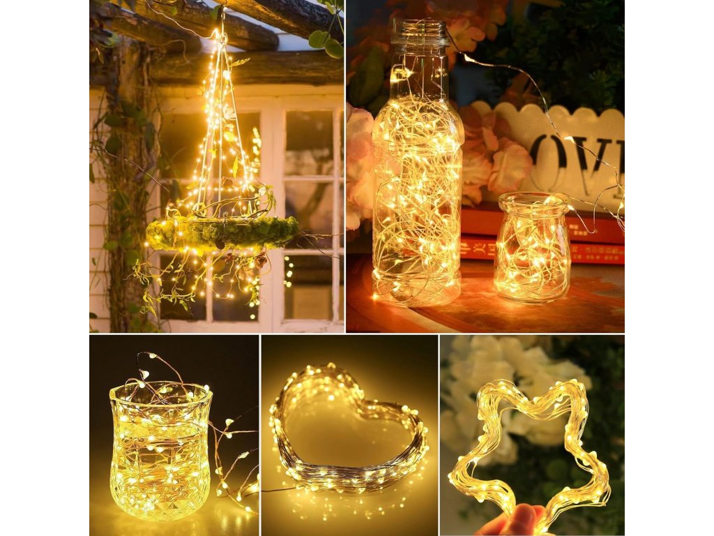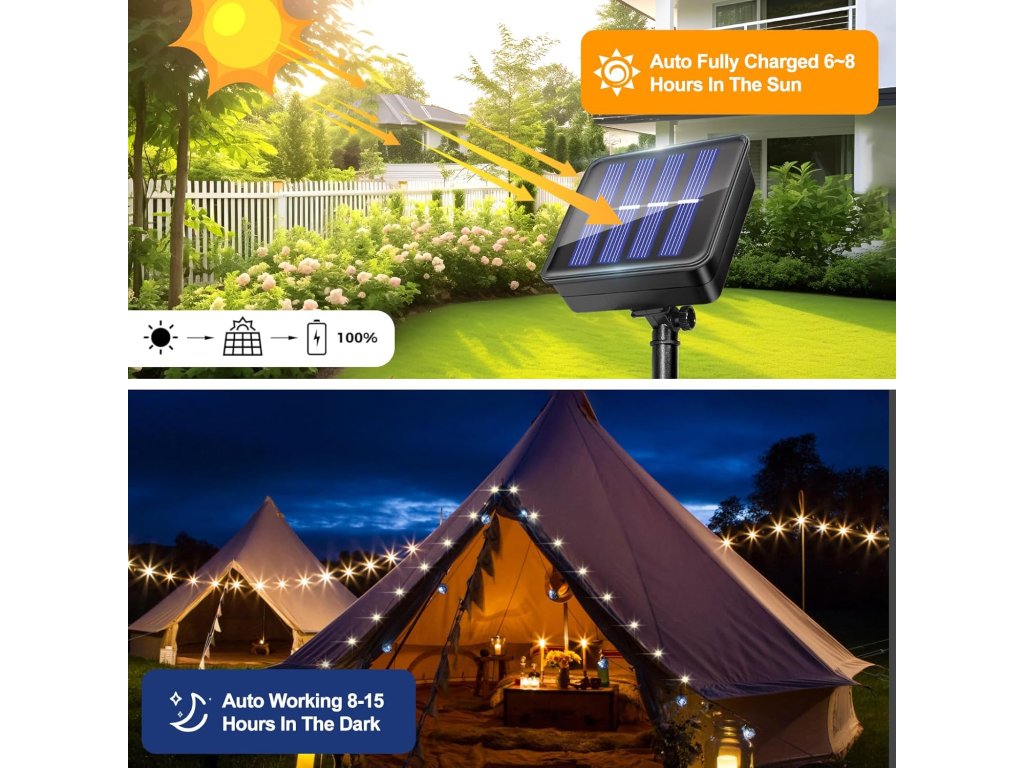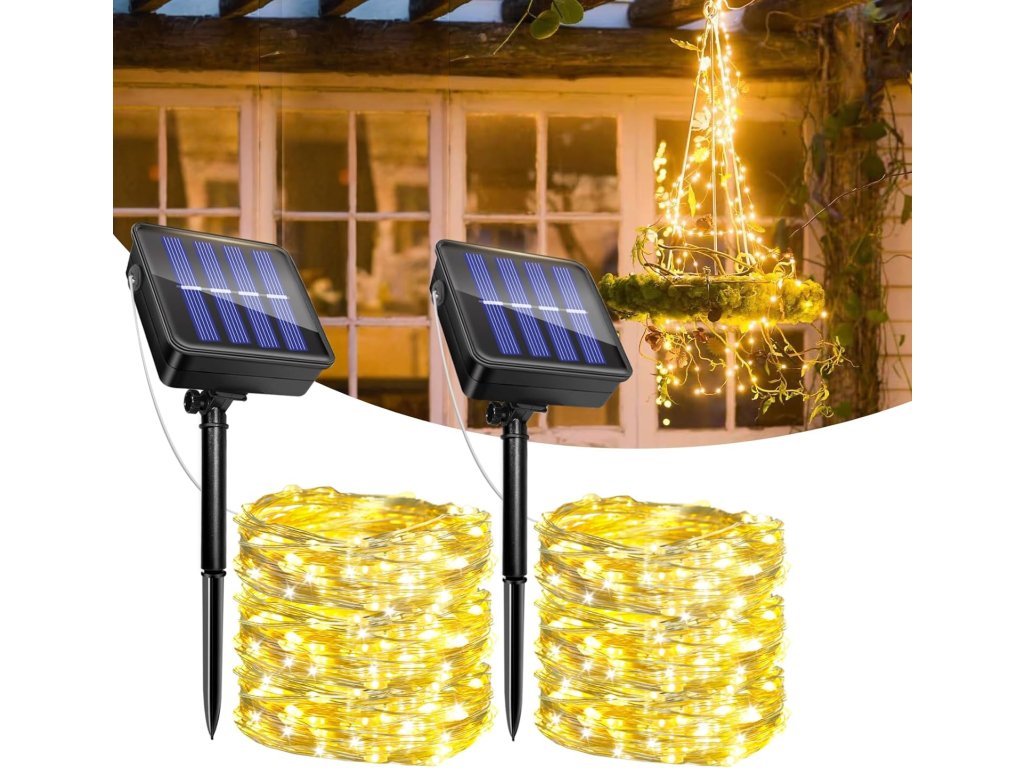 Jedná se o sadu dvou solárních LED světelných řetězů s délkou 12 metrů a 120 LED diodami v teplé bílé barvě.