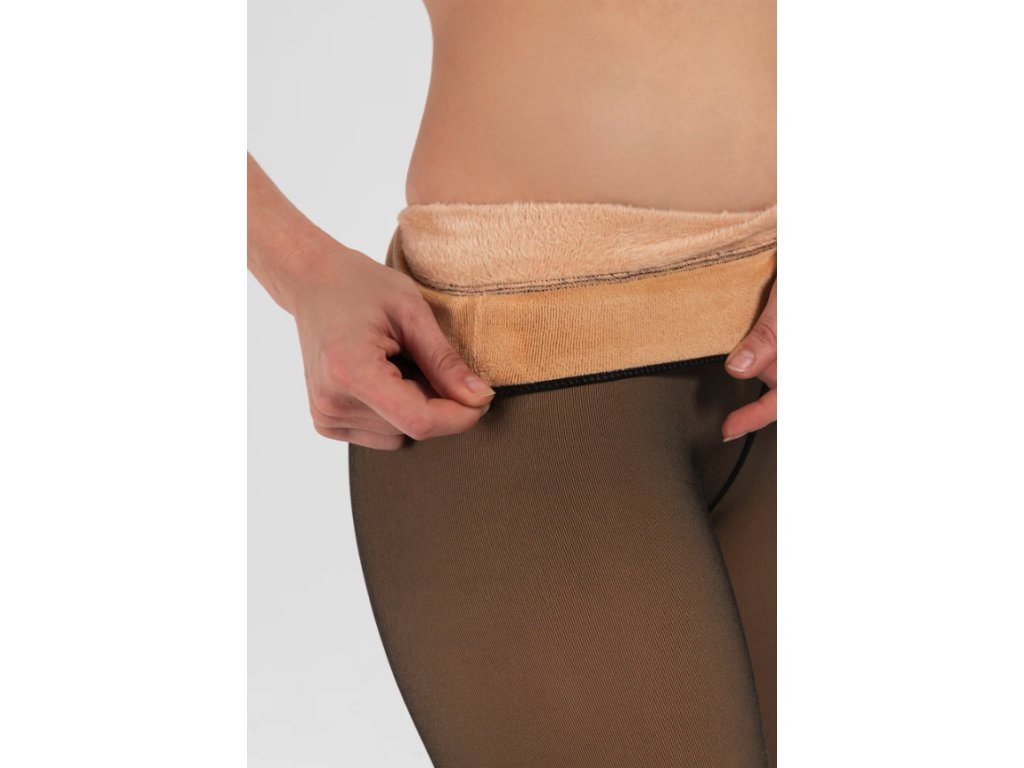 Produkt z řady Comfort značky Camano představuje ideální řešení pro zimní dny, kdy je vyžadován elegantní vzhled bez obětování tepelného komfortu. Punčochové kalhoty klamou tělem – navenek působí jako jemné silonky, ale uvnitř skrývají hřejivou a měkkou vrstvu, která udržuje nohy v teple i v nejchladnějším počasí. Tohoto efektu je dosaženo díky béžové podšívce, která prosvítá skrze černou vnější tkaninu a dodává noze přirozený vzhled.