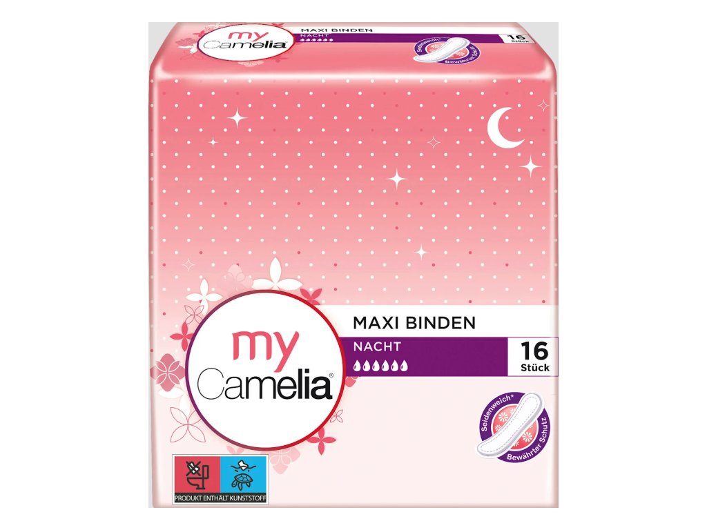 Camelia Maxi-vložky Noční, balení po 16 kusech, jsou hedvábně jemné a extra dlouhé, navržené pro spolehlivou ochranu a pocit sucha během noci. Nabízejí maximální savost a komfort pro klidný spánek.
