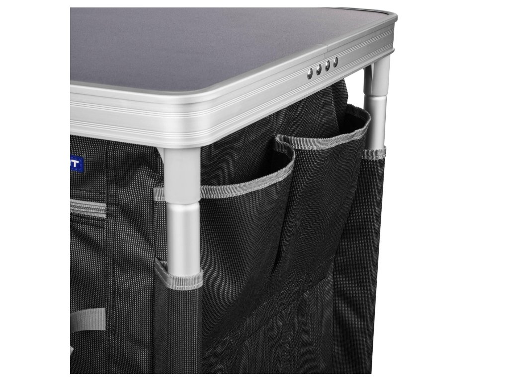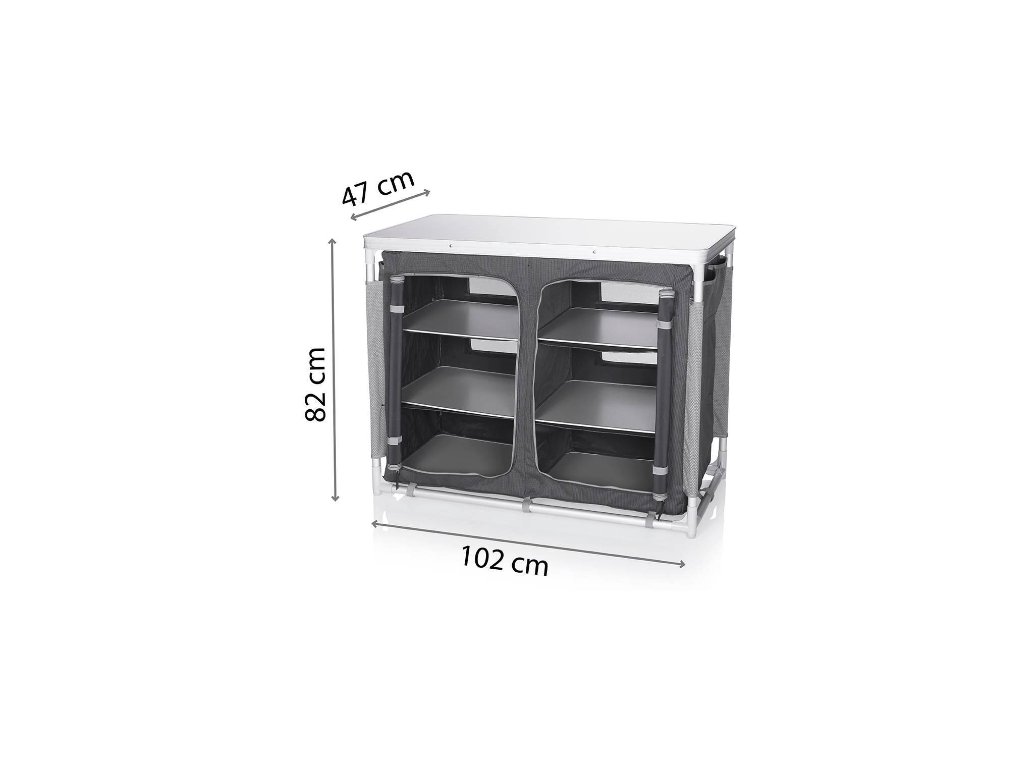 Tento kempingový regál je praktickým a stabilním řešením pro organizaci vaření a skladování potravin a nádobí během kempování. Konstrukce a materiál rám je vyroben z lehkého hliníku a materiál skříněk je polyester. Barva je kombinace černá a šedá. Úložný Prostor poskytuje velkou odkládací plochu 102 x 47 x 82 cm. Regál je vybaven šesti hlavními přihrádkami a dalšími přihrádkami na boku. Stabilitu na nerovném povrchu zajišťují čtyři nastavitelné nohy.