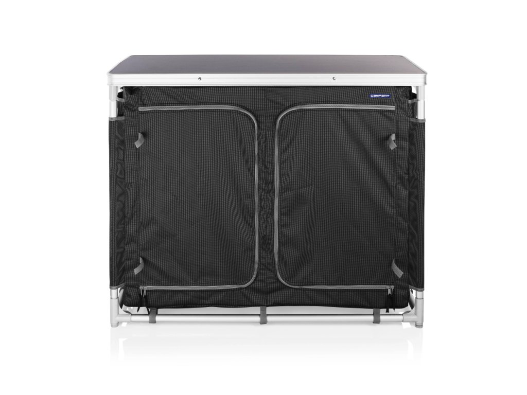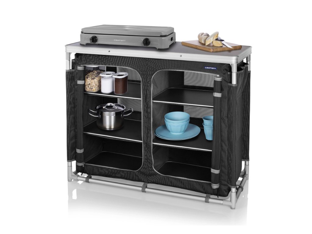 Campart Travel KI0734 Madrid je odolný kempingový regál do kuchyně navržený pro venkovní použití. Nabízí velkou pracovní a odkládací plochu a je vybaven celkem šesti přihrádkami plus dalšími bočními přihrádkami pro uložení kempingového vybavení. Díky hliníkovému rámu je velmi lehký (7,7 kg). Lze jej snadno složit do kompaktních rozměrů a přenášet v dodávaném pouzdře. Stabilitu zajišťují čtyři nastavitelné nohy které se přizpůsobí i nerovnému terénu.