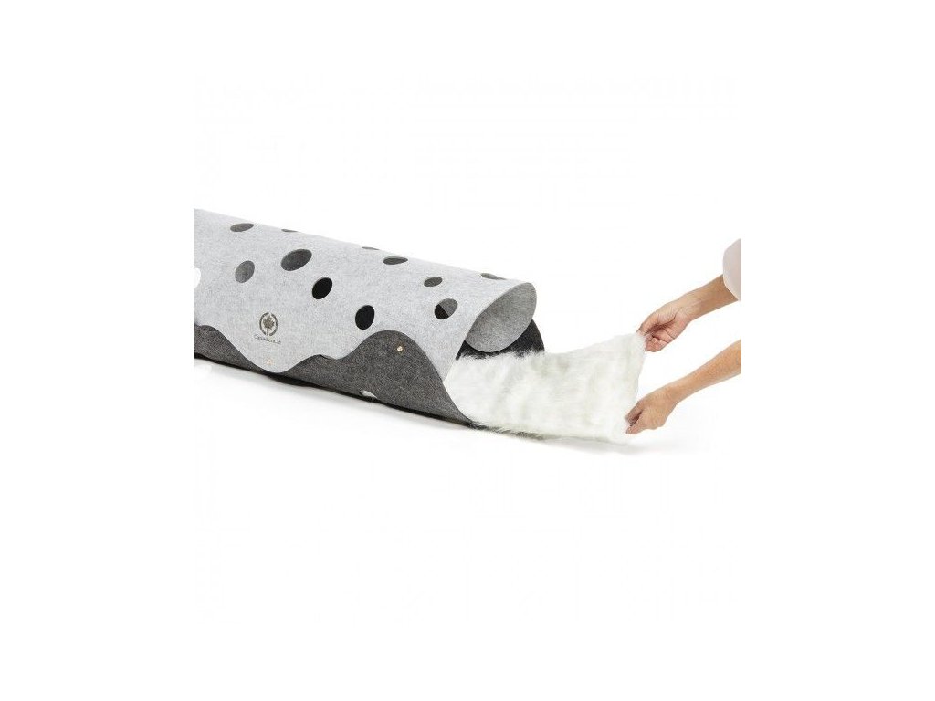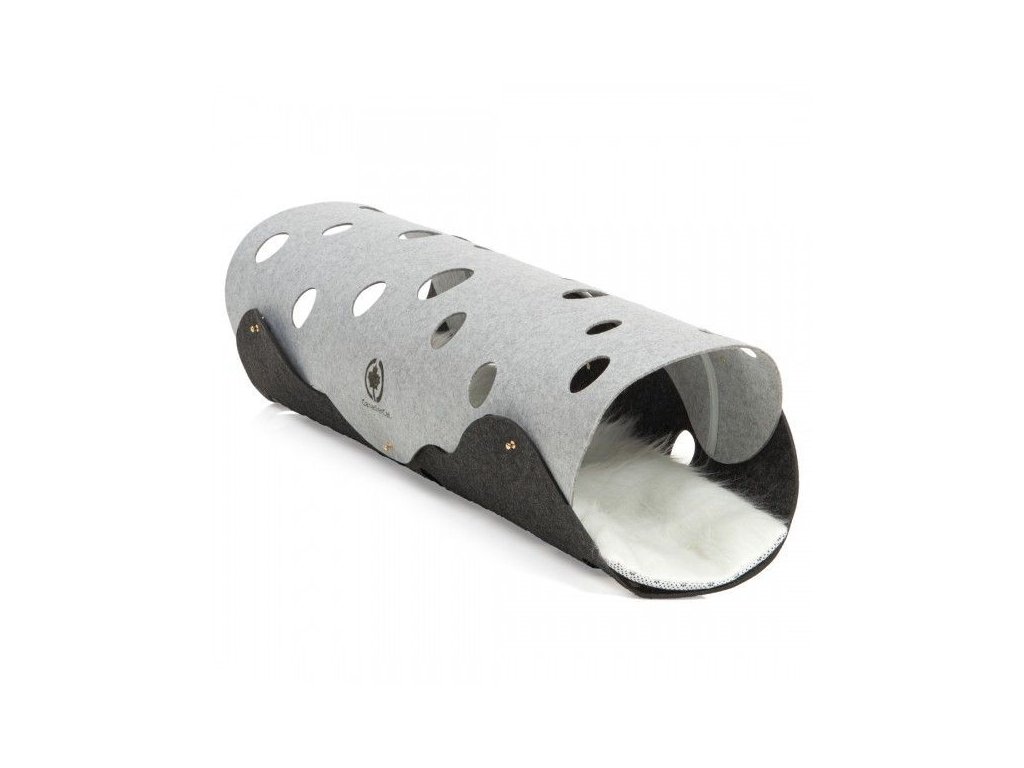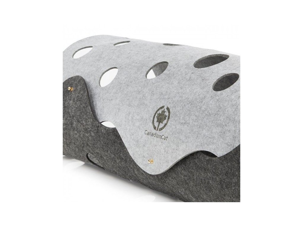 CanadianCat Plstěný tunel je dvoudílný designový tunel pro kočky, vyrobený z odolné plsti. S celkovými rozměry 120 x 30 x 30 cm (Š/H/V) a hmotností 2,90 kg poskytuje dostatek prostoru pro hru i spánek. Je vybaven pozlacenými šrouby pro snadnou montáž a demontáž, četnými kukátky a součástí je i bílá plyšová podložka. Je ideální pro velká plemena koček a podporuje přirozený pohyb.