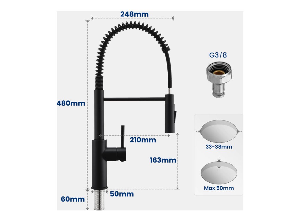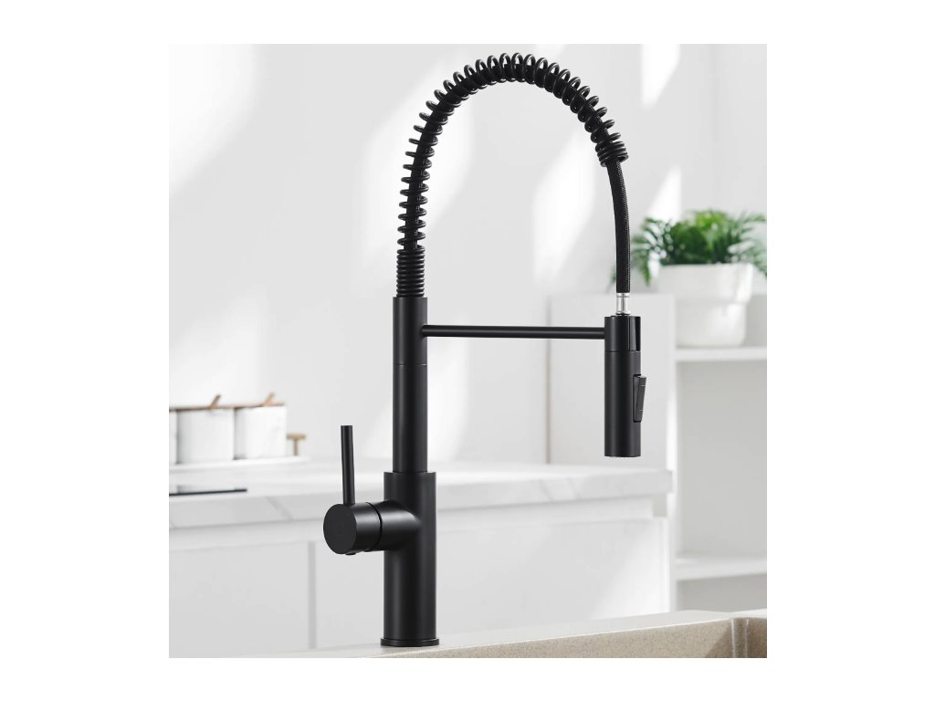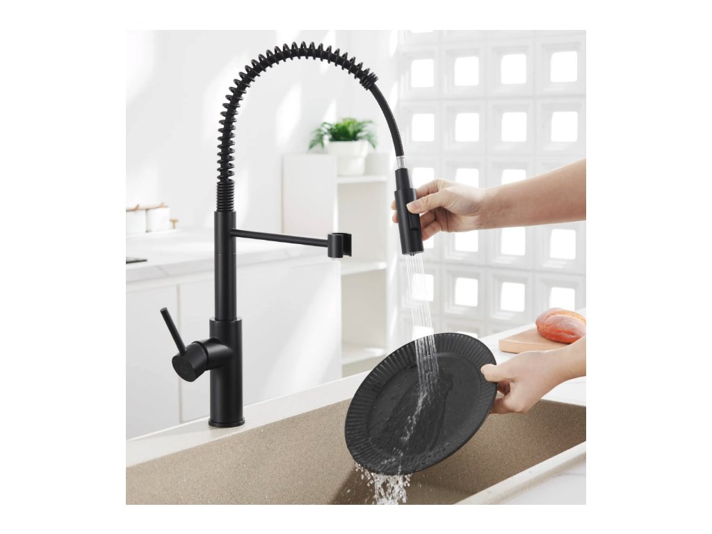 Kuchyňská baterie CECIPA v černé barvě s elegantním pružinovým designem je ideální pro moderní kuchyně. Je vybavena dvěma funkcemi průtoku vody a otočným ramenem o 360 stupňů.