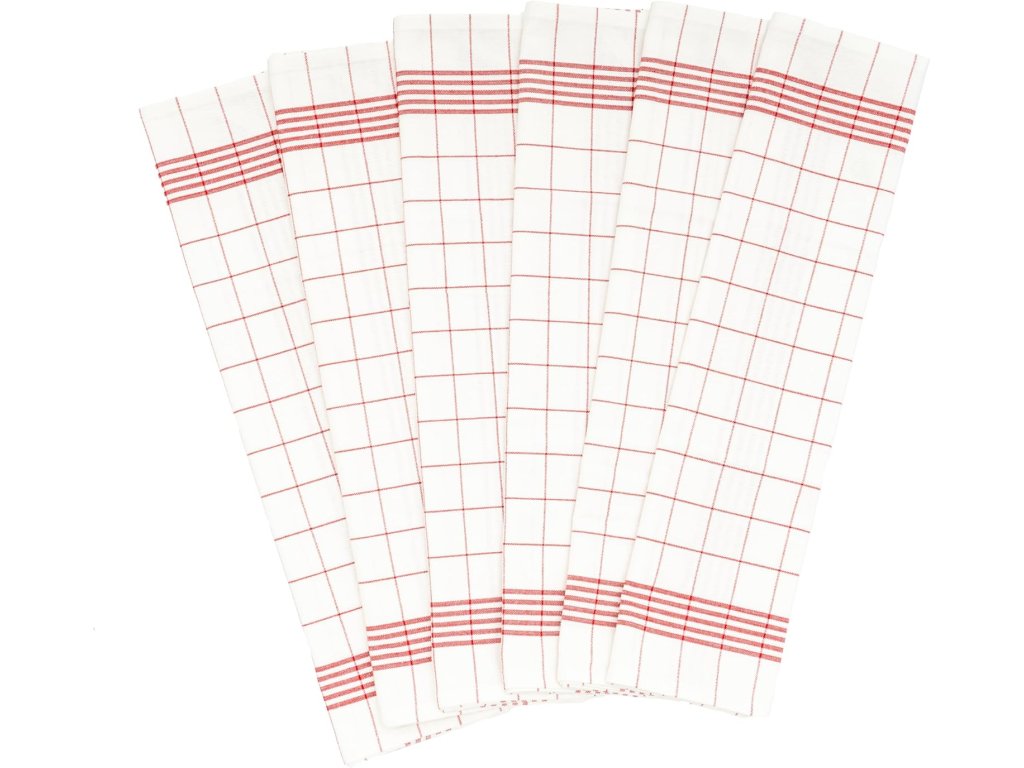 Sada 10 červených kuchyňských utěrek vyrobených ze 100% bavlny s vysokou savostí pro rychlé utírání rozlitých tekutin a nečistot. Tyto extra velké utěrky (cca 50 x 76 cm) s kostkovaným vzorem nepouští vlákna a jsou opakovaně použitelné, vydrží časté praní bez ztráty měkkosti a tvaru. Praktické poutko na zavěšení usnadňuje skladování a rychlý přístup. Ideální pro utírání nádobí, ochranu kynoucího těsta, ukládání čerstvě upečených výrobků nebo zakrývání větších hrnců a pánví.