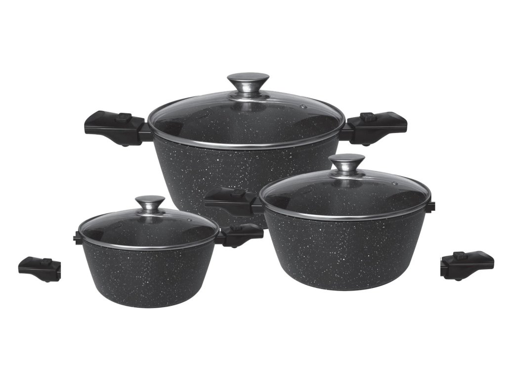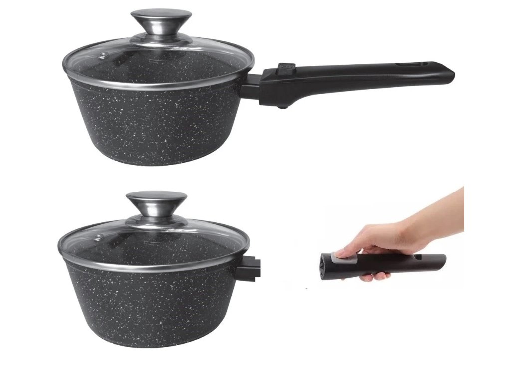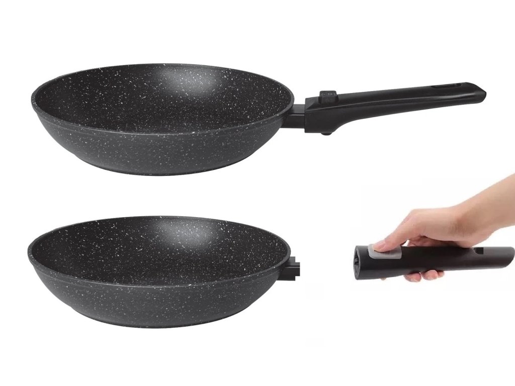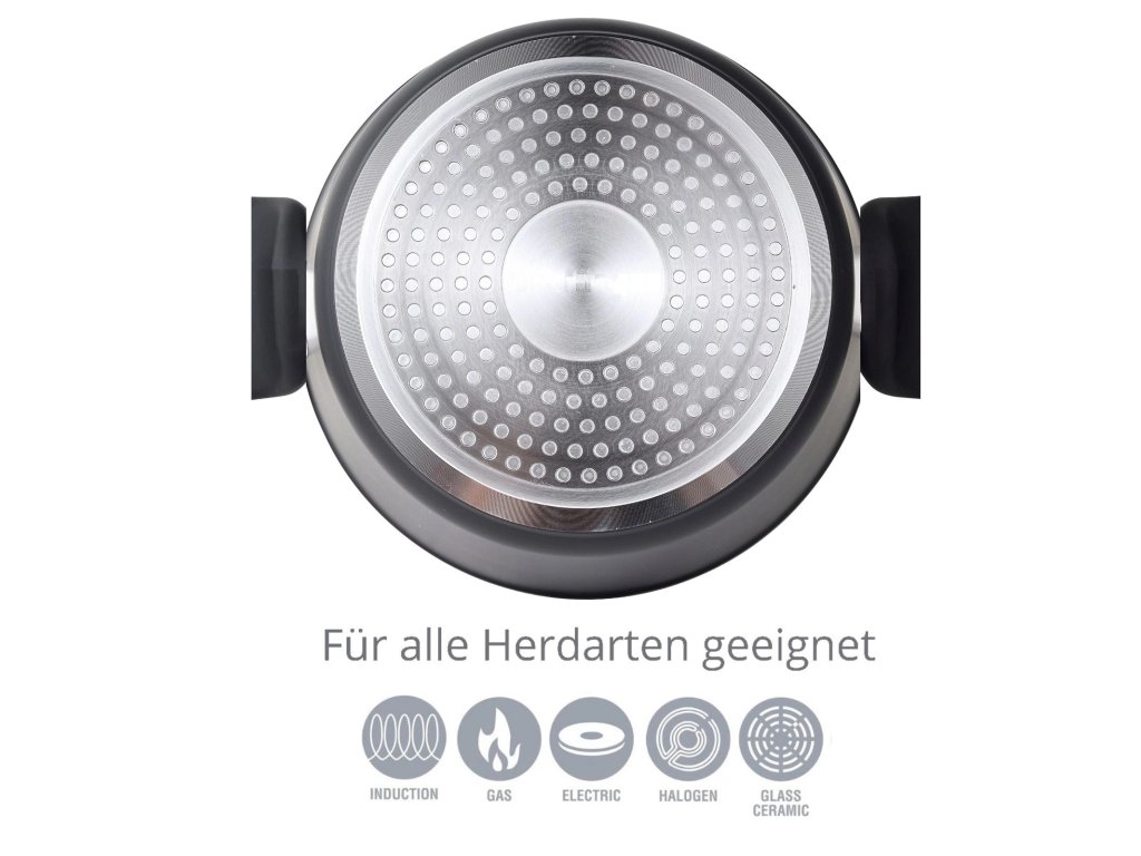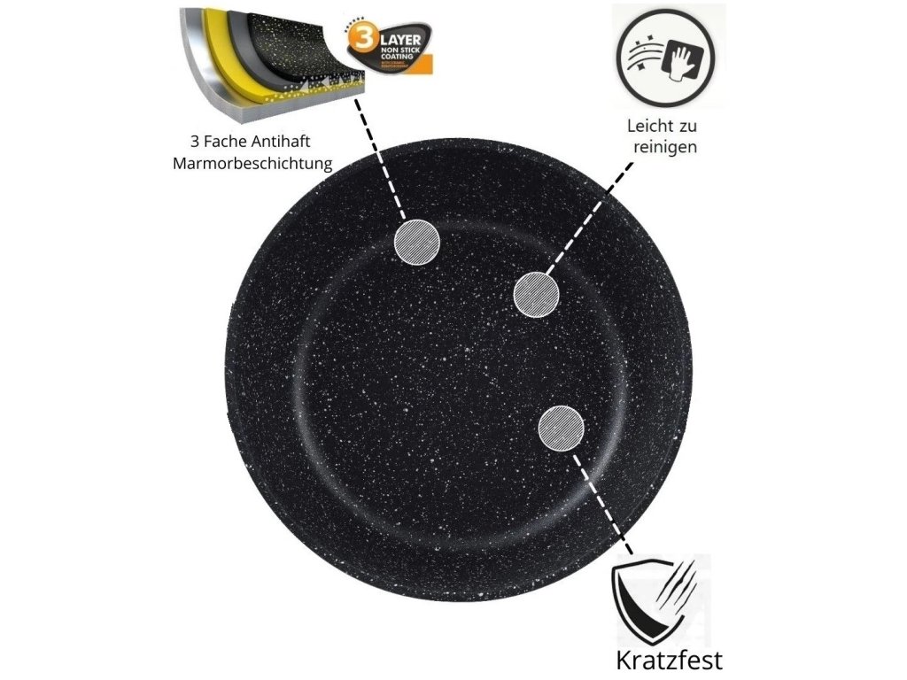 Materiál a Povrch vyrobeno z litého hliníku s 3 vrstvou mramorovou nepřilnavou vrstvou. To zajišťuje vynikající distribuci tepla a snadné obracení pokrmů. Povrch je kratzfest a snadno se čistí. Vhodné pro všechny běžné typy sporáků včetně plynových elektrických keramických a indukčních. Odnímatelné rukojeti šetří místo při skladování a usnadňují mytí. Snadno se čistí a je vhodné do myčky na nádobí. Materiál: Litý hliník a sklo, barva: černá, rozměry: průměry 16 až 28 cm.