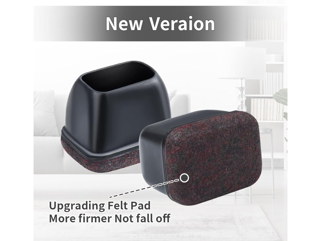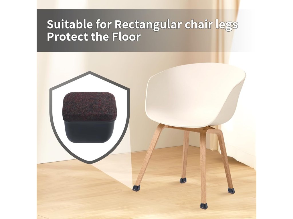 Sada 32 kusů obdélníkových chráničů na nohy židlí. Vyrobeny z odolného černého silikonu s připevněnými zesílenými plstěnými podložkami pro maximální ochranu tvrdých podlah před poškrábáním a snížení hluku při pohybu nábytku. Vhodné pro čtvercové nohy židlí o šířce 18-22 mm a délce 24-30 mm. Snadná instalace bez nutnosti nářadí - stačí natáhnout a nasadit. Omyvatelné a opakovaně použitelné.