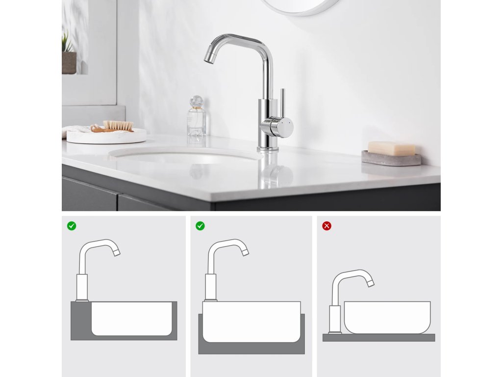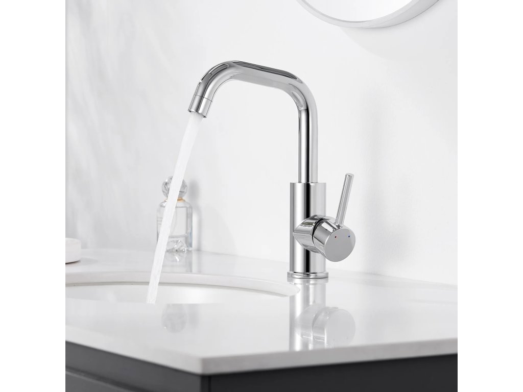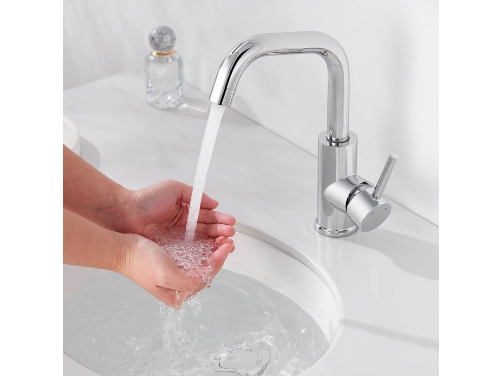 Chromovaná koupelnová umyvadlová baterie s 360° otočným výtokem. Vyrobena z nerezové oceli 304, úspora vody až 40 %, keramický ventil, snadná instalace.