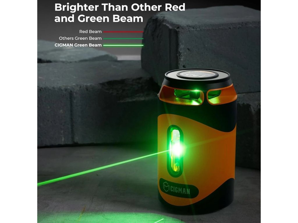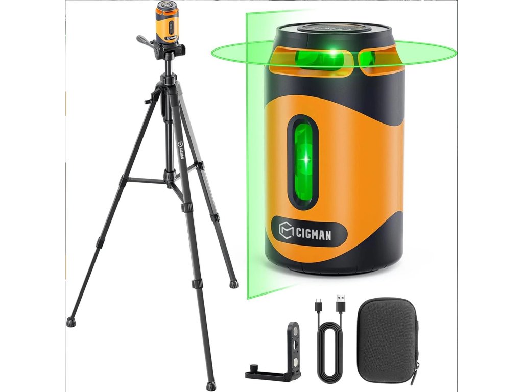 CIGMAN CM 505 je samonivelační laserová vodováha s 360° horizontálním a 180° vertikálním zeleným paprskem. Nabízí tři režimy (samonivelační ruční pulzní) a čtyři nastavení jasu. Je napájena vestavěnou dobíjecí baterií 2000 mAh s nabíjením typu C (nabíječka není součástí balení).