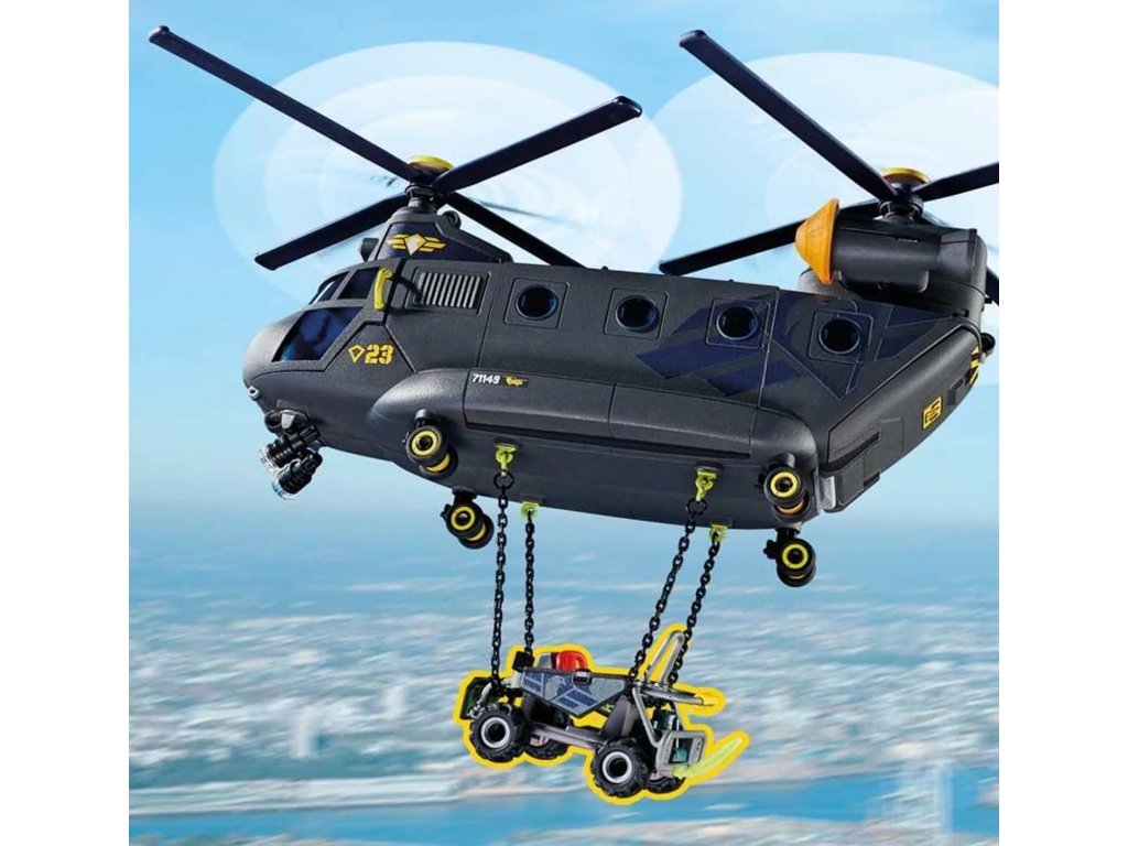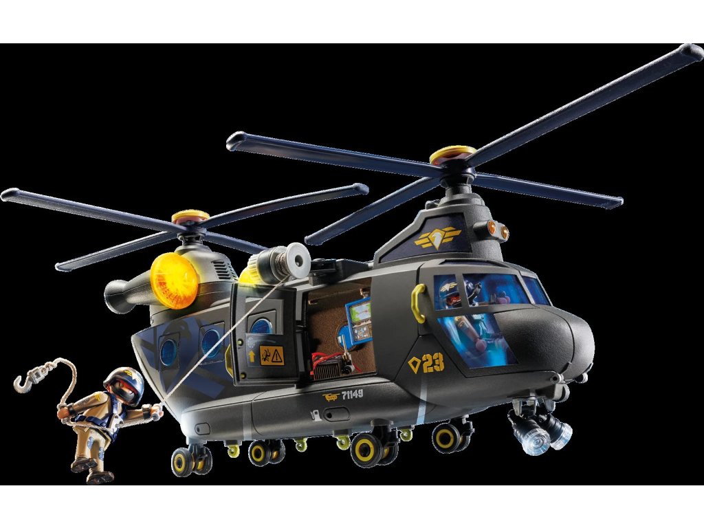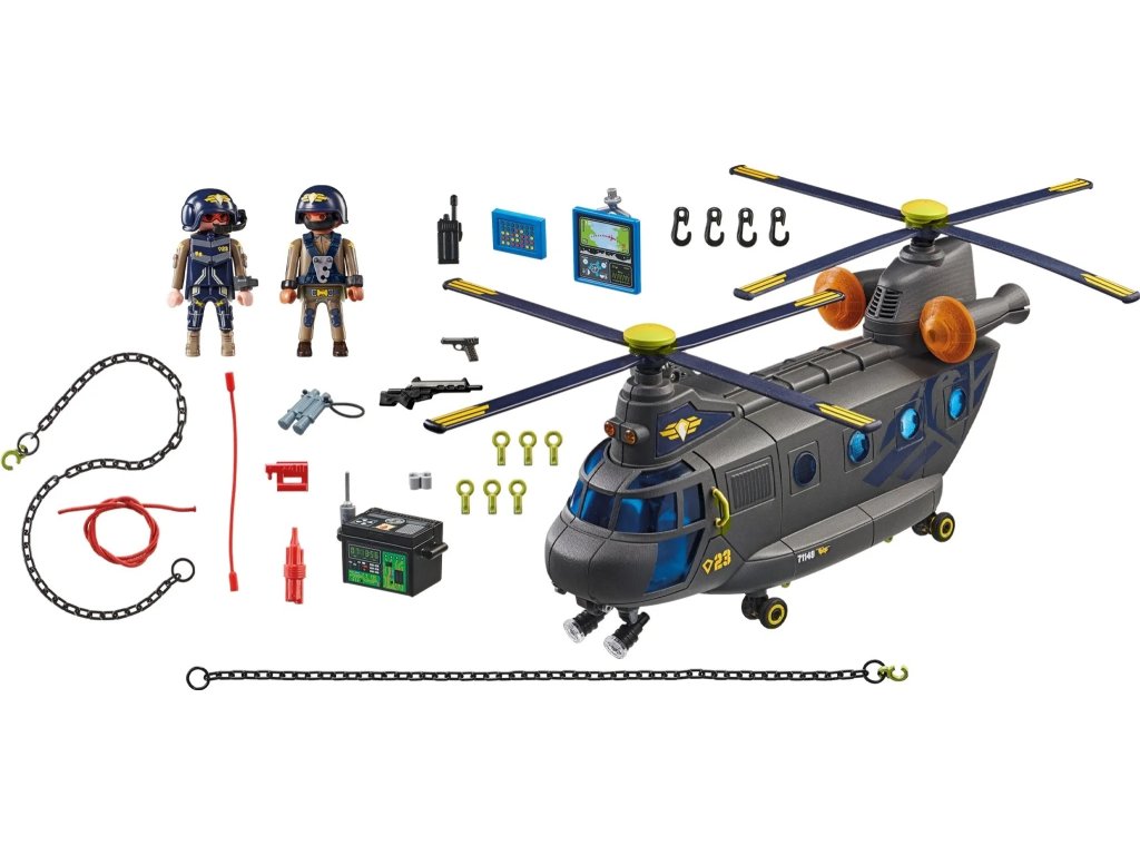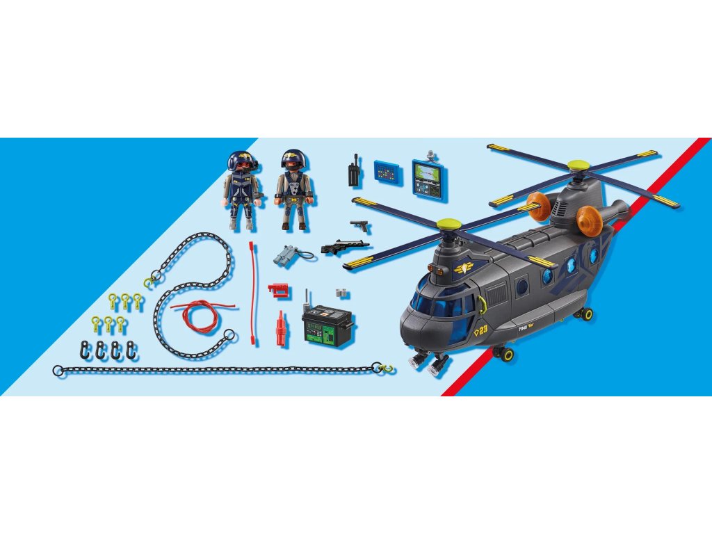 Pro optimální hru je možné vrtulník otevřít ze všech čtyř stran (okno kokpitu zadní dveře boční klapka). Sada obsahuje 117 dílků včetně dvou figurek SWAT policistů a doplňků jako jsou řetězy krabička s bombou dynamit vysílačka pistole kulomet dalekohled a helma. Je vyrobena z kvalitního a odolného plastu s rozměry 460 x 284 x 150 mm a váhou 1,29 kg.