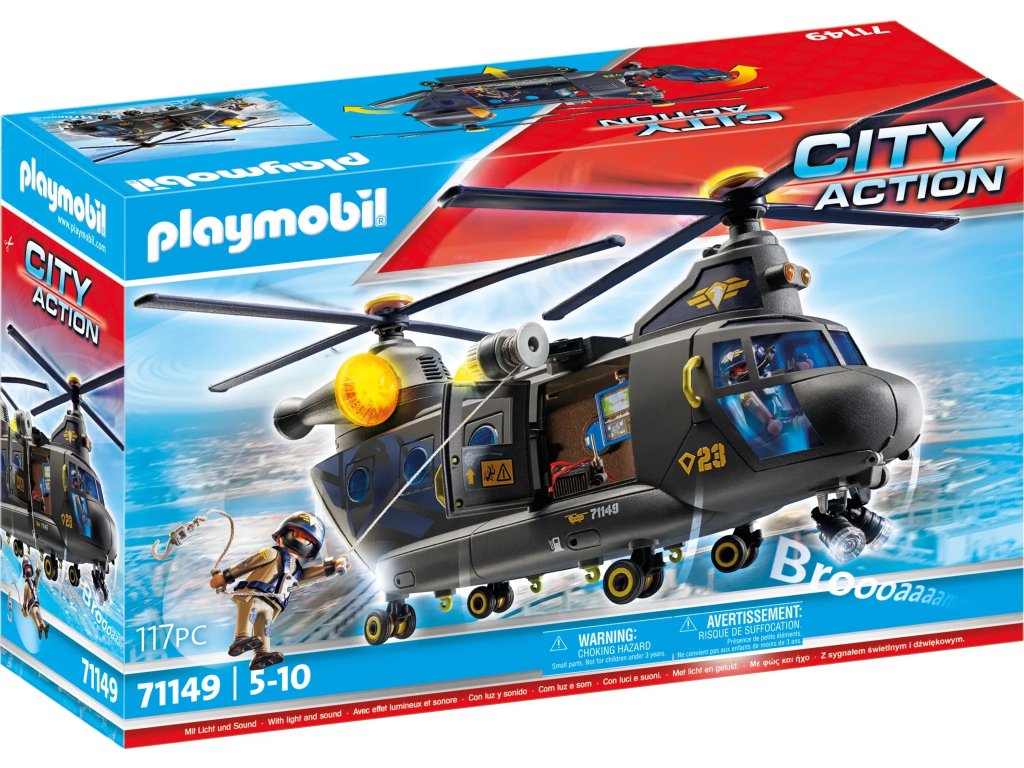 Záchranářský vrtulník SWAT (71149) je detailně propracovaná hrací sada ze série City Action se 117 dílky určená pro děti od 5 let. Vrtulník má světelný a zvukový modul aktivovaný pohybem rotoru a je vybaven navijákem a osvětleným nákladovým prostorem. Balení obsahuje dvě figurky SWAT a bohaté policejní vybavení pro akční záchranné mise.
