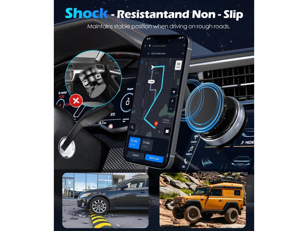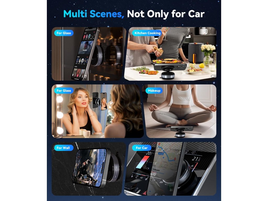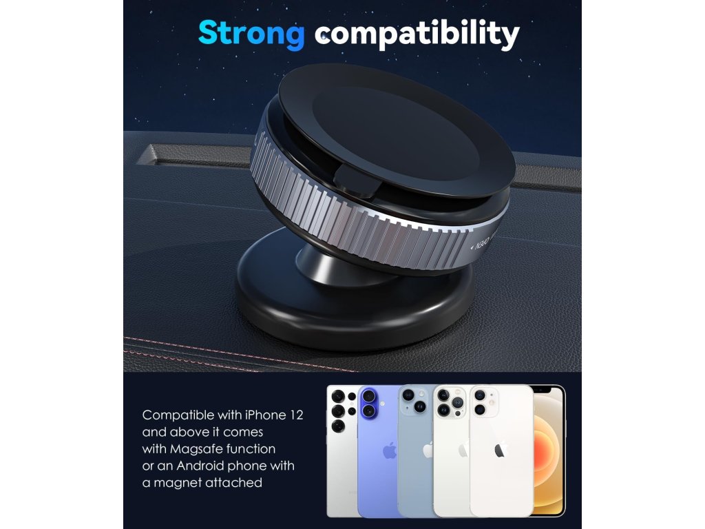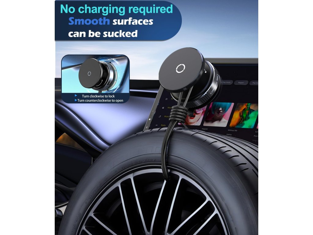 Držák využívá vakuovou přísavku, kterou aktivujete jednoduchým otočením. Přísavka se pevně přichytí na jakýkoli hladký povrch, jako je palubní deska, čelní sklo, zrcadlo nebo dlaždice. Pro odinstalování stačí otočit v opačném směru a držák odstraníte beze stop. Vnitřní N52 magnet zajišťuje, že telefon zůstane na místě, i když jedete po hrbolaté silnici, v ostré zatáčce nebo při prudkém brzdění.