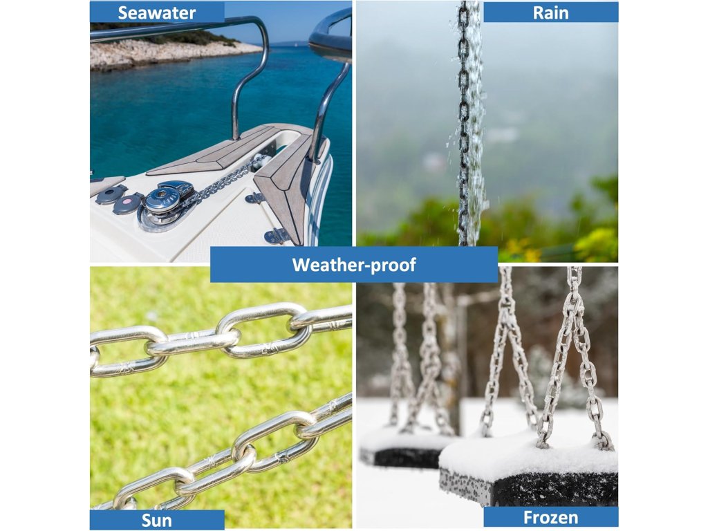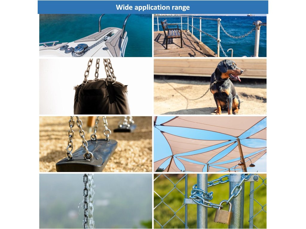 Díky krátkým článkům je řetěz flexibilnější než řetězy s dlouhými články, a tak se tolik nezamotává. Jeho mez pevnosti v tahu je 400 kg, což zaručuje, že je vhodný pro téměř jakékoli použití, ať už ho potřebujete na upevnění, zavěšení nebo jako zabezpečení. Můžete ho použít například jako bezpečnostní řetěz, řetěz na květináče, na houpačku, nebo na psa.