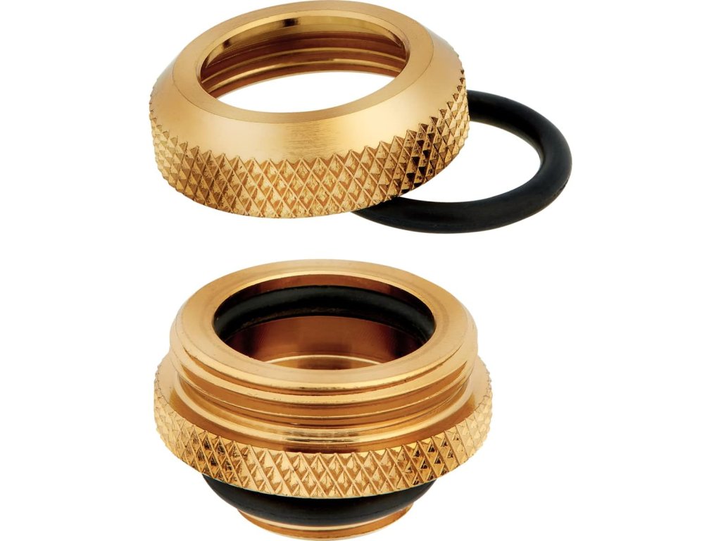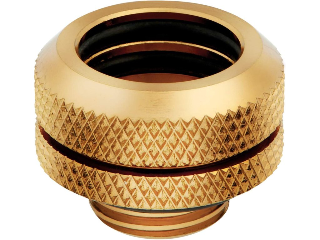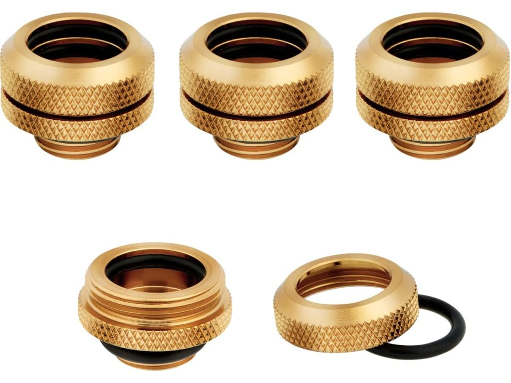 Sada 4 zlatých fittingů Corsair Hydro X Series XF Hardline pro 14mm OD trubky. G1/4" závit, mosazná konstrukce, dvojité O-kroužky.