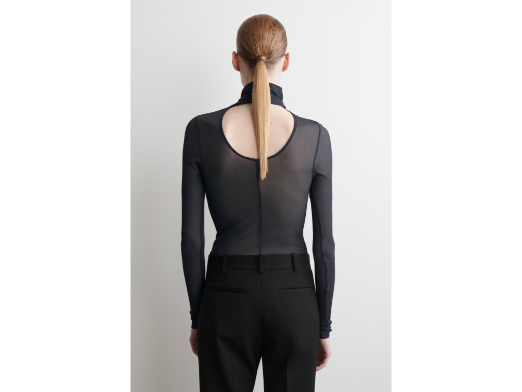 Top má vykrojená záda a přiléhavý stojáček s vázačkou, což dodává modelu moderní a výrazný charakter. Skvěle se hodí k elegantním kalhotám, sukni nebo jako stylový večerní outfit.