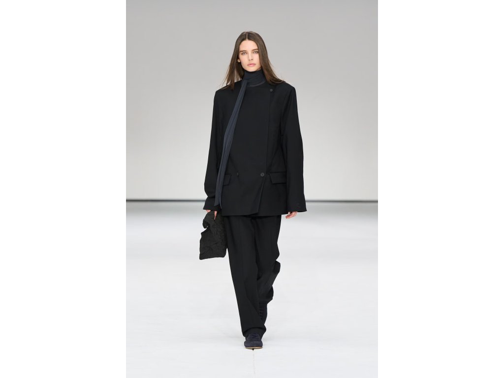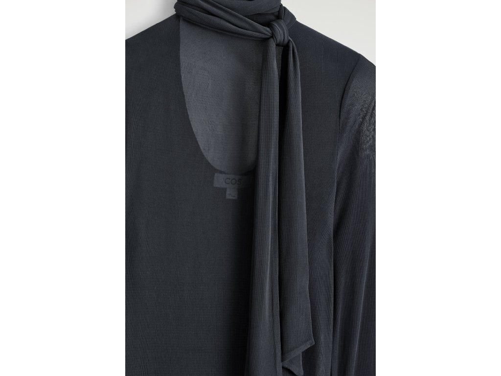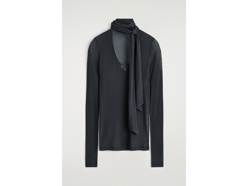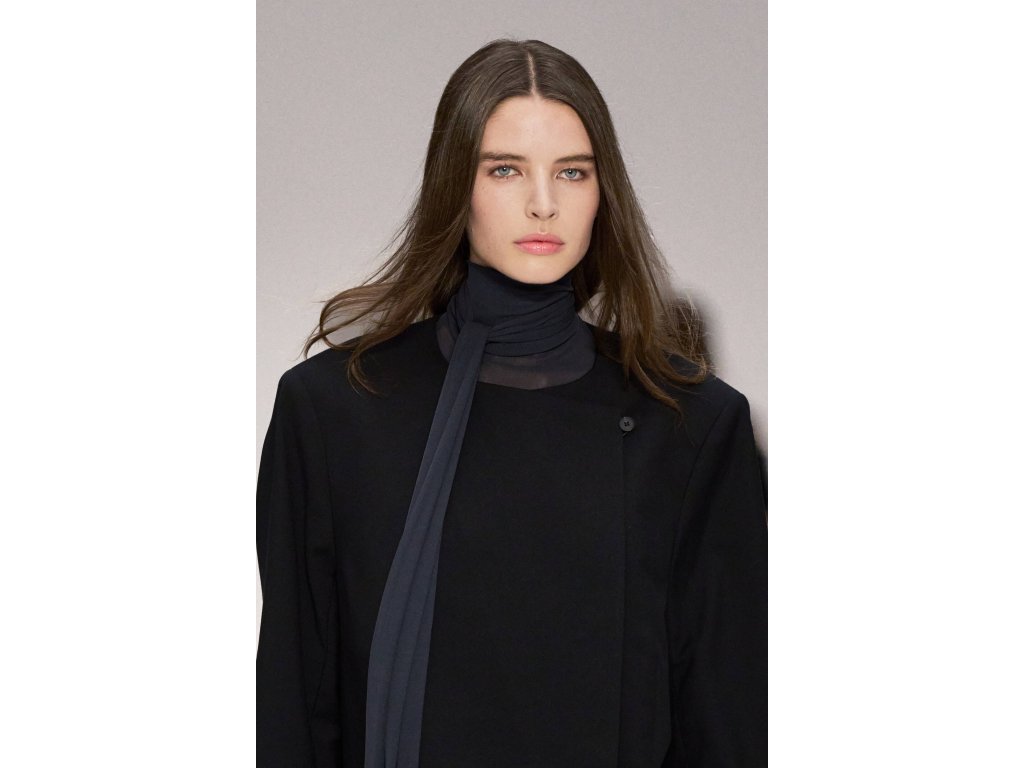 Model má úzký slim fit střih, který zvýrazňuje siluetu. Charakteristickým prvkem je šálový detail (scarf detail) ve stejné barvě, který lze elegantně omotat kolem krku a vytvořit sofistikovaný vzhled.