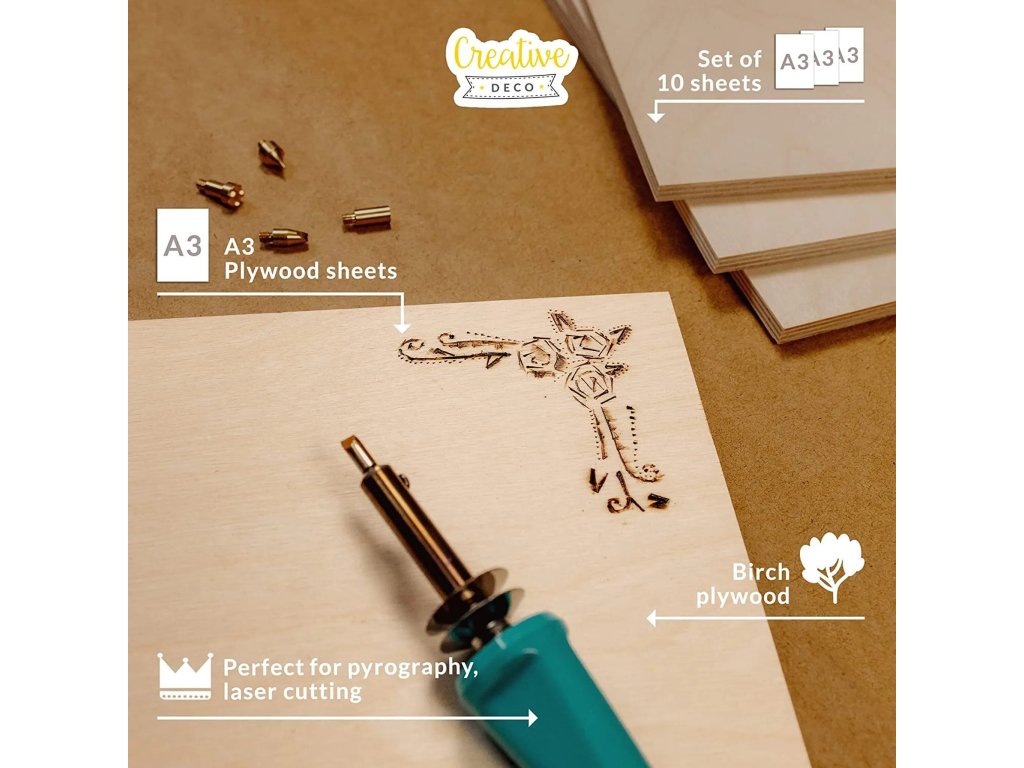 Sada 10 kusů kvalitní březové překližky Creative Deco ve formátu A3 (420 x 300 x 4 mm). Tyto tenké dřevěné odřezky třídy B/B mají hladký, broušený povrch a bezpečné, zaoblené hrany. Jsou ideální pro širokou škálu kreativních a řemeslných projektů, jako je laserové řezání, CNC frézování, modelářství, gravírování, pyrografie, decoupage, malování, moření a mnoho dalších DIY aktivit. Překližka je vhodná i pro stavební účely, nábytkářství a jako podklad pro dřevěné podlahy. Vyrobeno v EU z přírodních a netoxických materiálů.