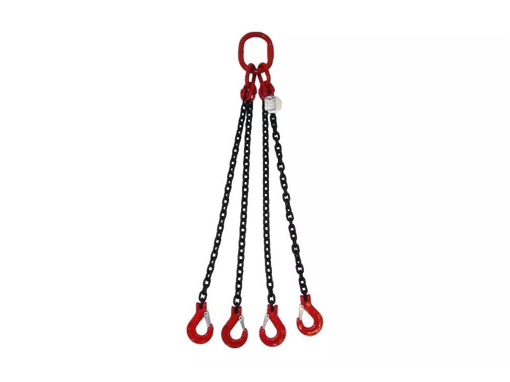 Čtyřpramenný zvedací řetězový závěs o délce 1,5 metru, tloušťce 10 mm, třída 8, s nosností až 6700 kg (při úhlu 0-45°). Bez zkracovacích prvků, vybaven posuvnými háky a černým nátěrem. Vyrobeno a testováno v Německu.
