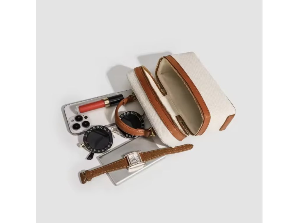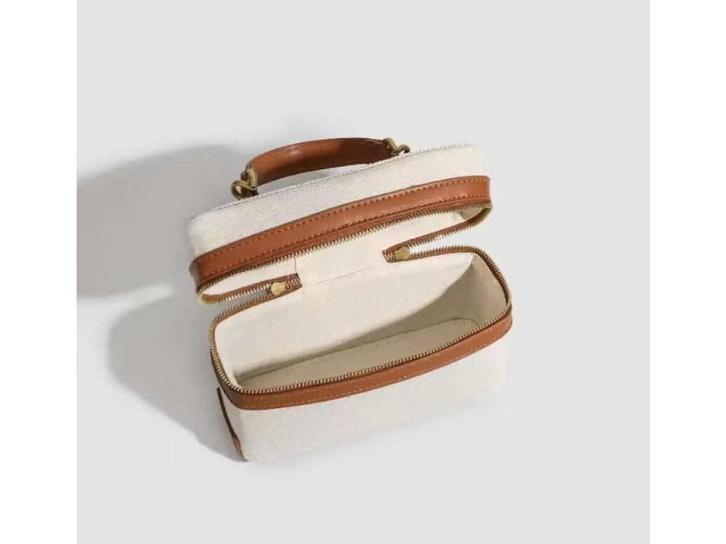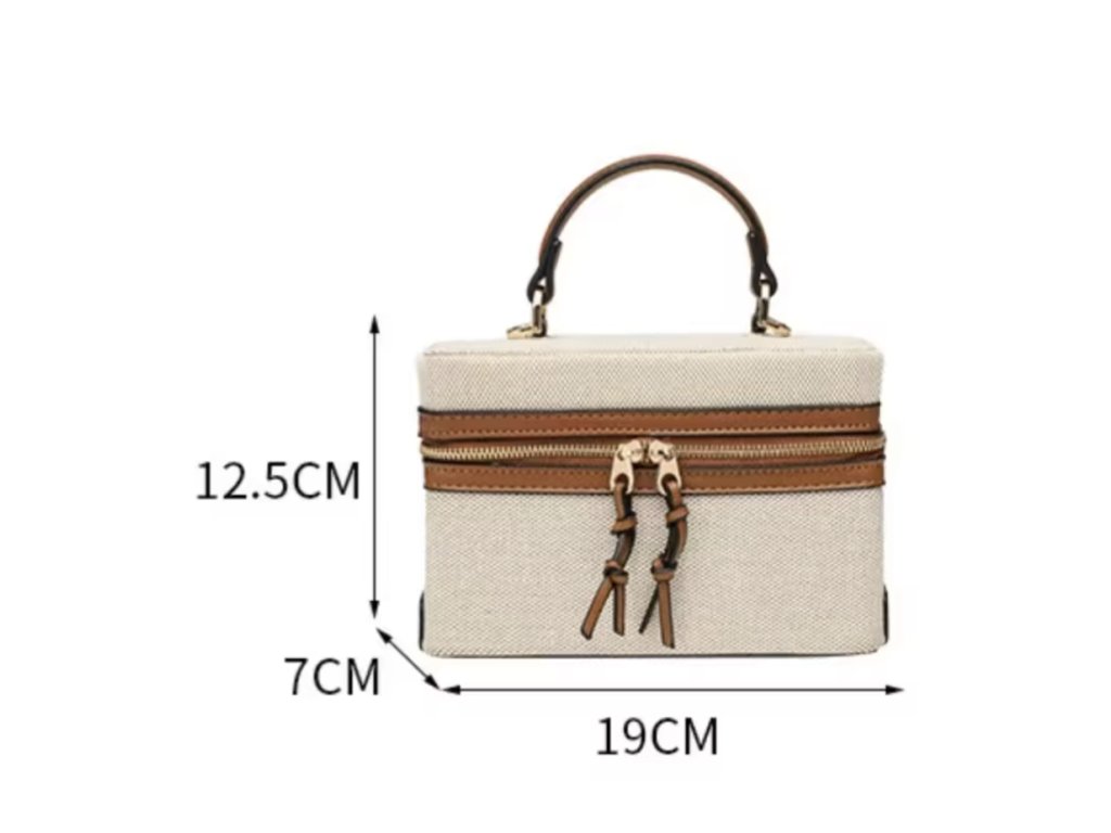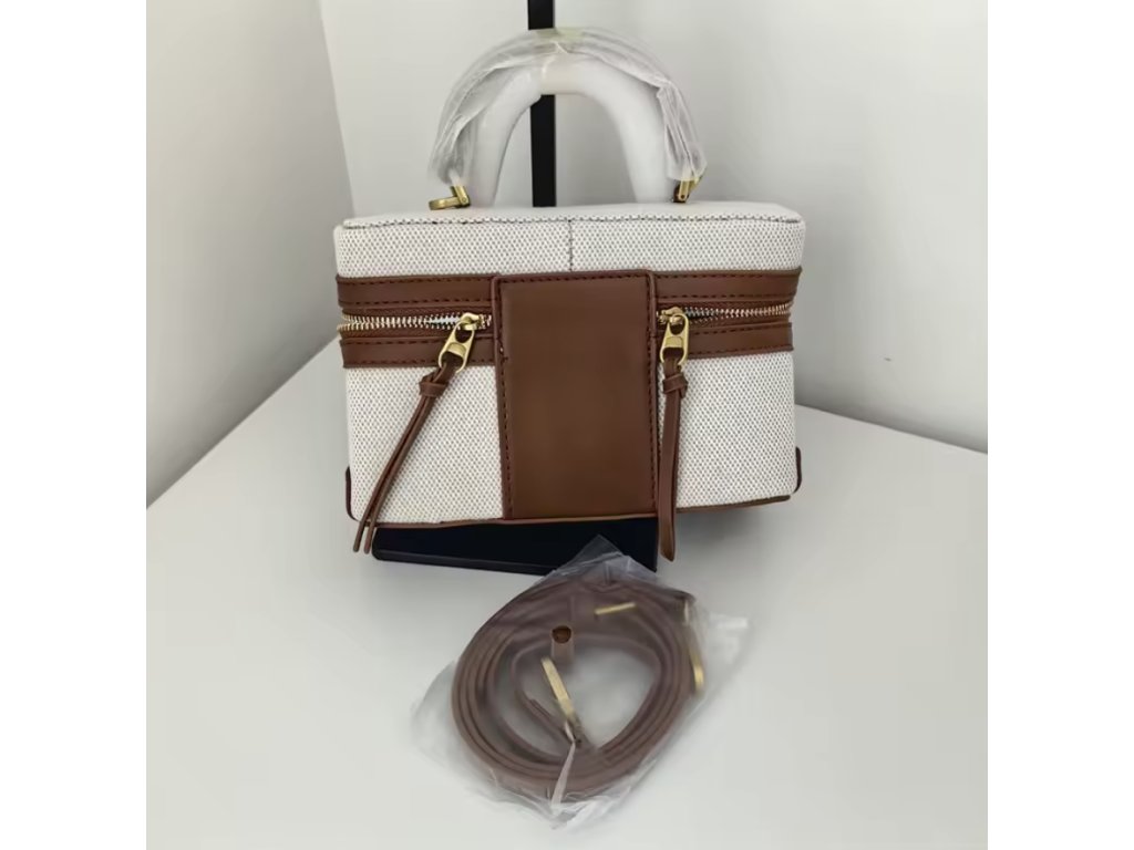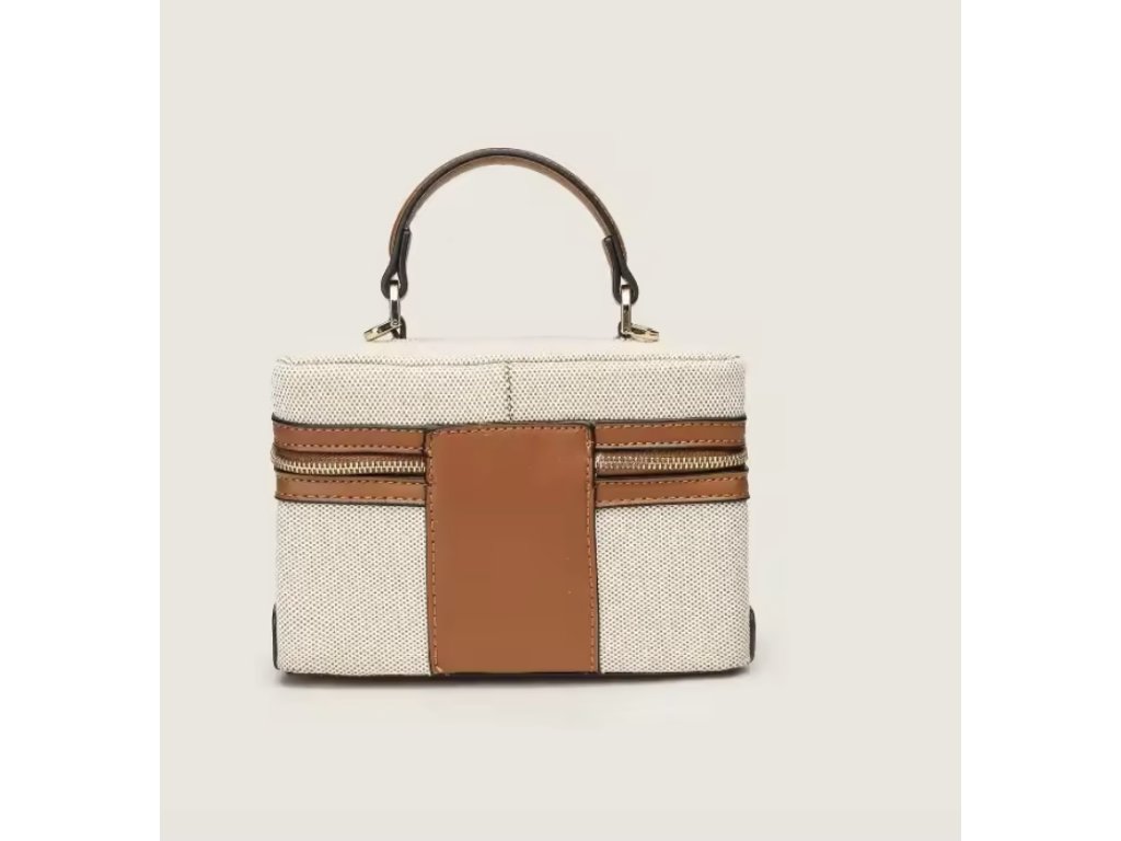 Elegantní dámská crossbody kabelka s dvojitým zipem je navržena pro rok 2024. Tato malá čtvercová kabelka v béžovo-hnědé barvě je vyrobena z vysoce kvalitní kůže a plátna. Její design se inspiroval módou „patchwork“ a je ideální pro každodenní nošení.
