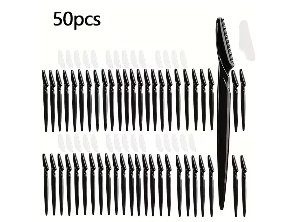 Dámské a pánské nerezové holicí strojky na obličej 50 ks – černé, tvarovače obočí s ochranným krytem