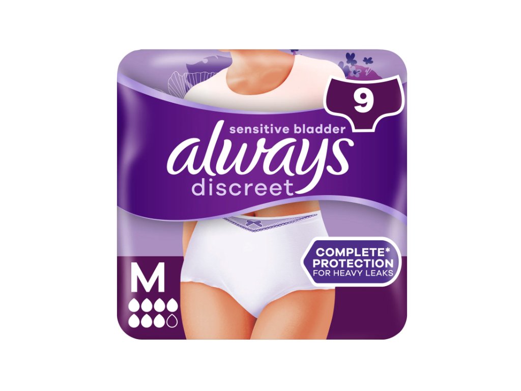 Dámské inkontinenční kalhotky Always Discreet ve střední velikosti (EU 36-42) v bílé barvě poskytují extra silnou ochranu proti úniku moči (savost 7). V jednom balení najdete 9 kusů.