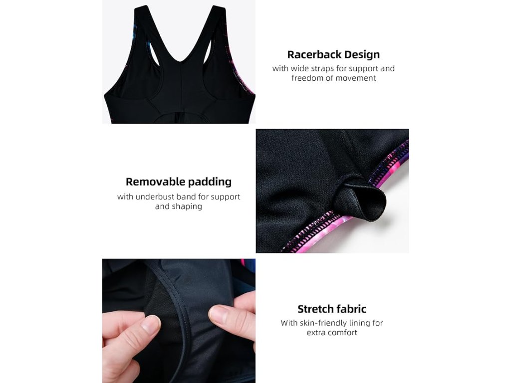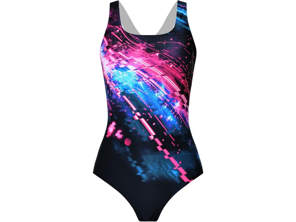 Zadní část je řešena ve sportovním stylu racerback, který umožňuje volnost pohybu ramen a zároveň zlepšuje pohodlí při plavání. Materiál je odolný vůči chlóru, prodyšný a poskytuje UV ochranu UPF 50+, což oceníte při pobytu na slunci.