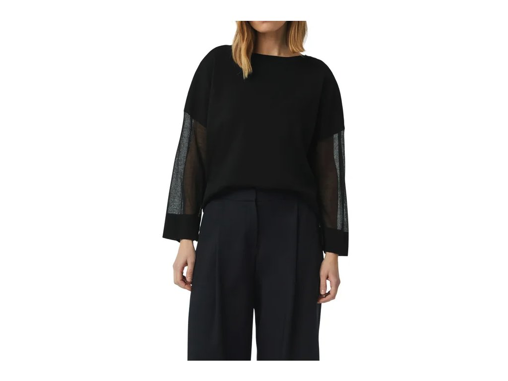kontrast mezi pleteným tělem a průsvitnými rukávy vytváří originální vzhled