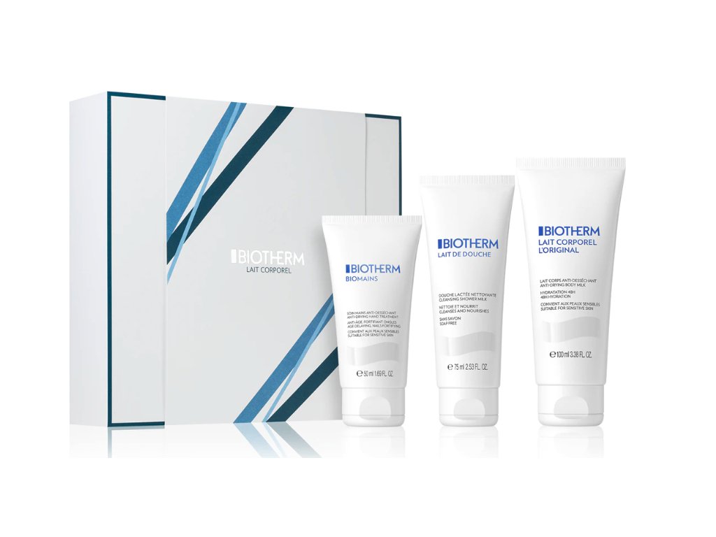 Dárková sada Biotherm Lait Corporel obsahuje cestovní balení tří produktů: hydratační tělové mléko, čisticí sprchové mléko a hydratační krém na ruce s SPF 4. Je vhodná pro všechny typy pleti.