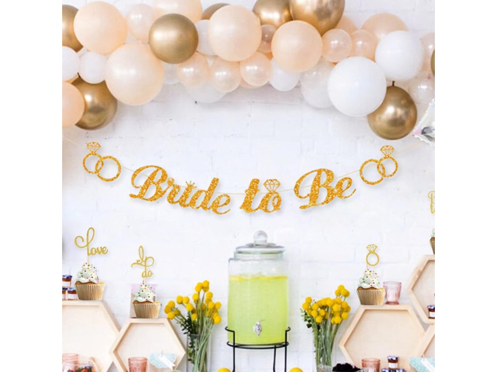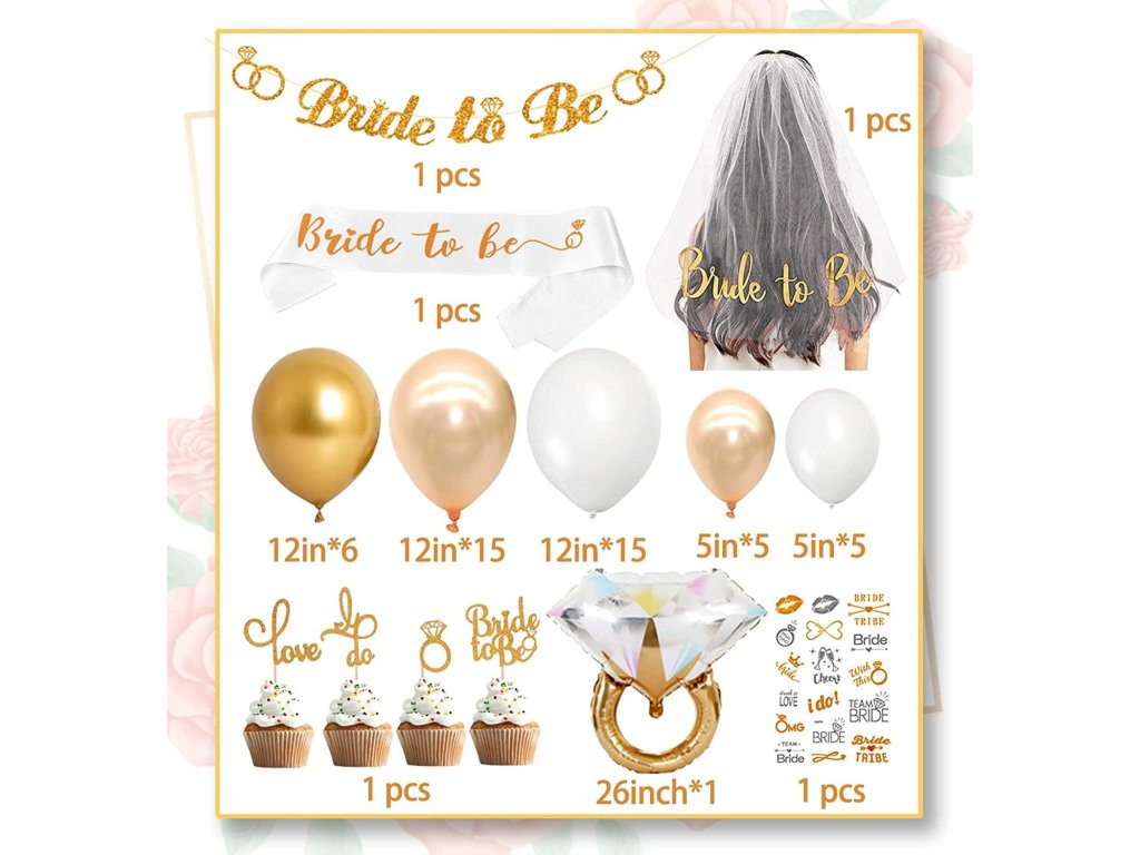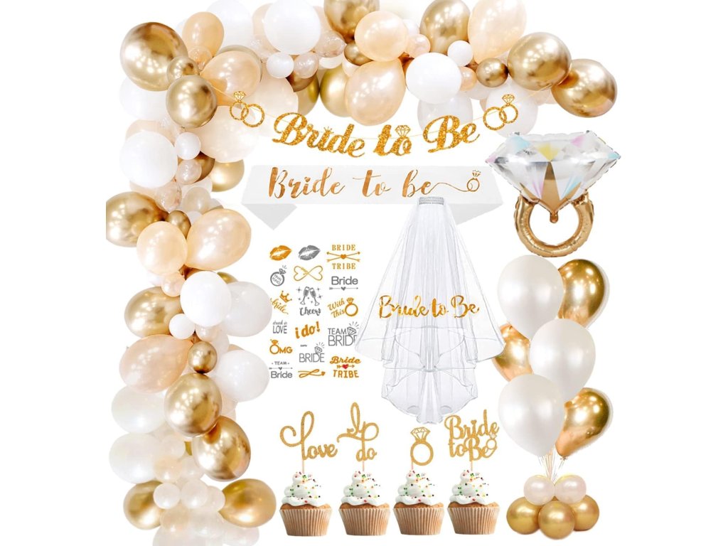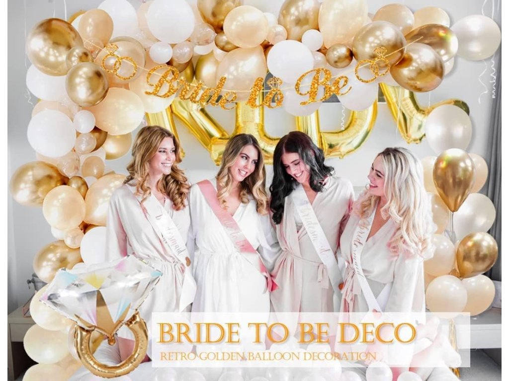 Sada dekorací pro rozlučku se svobodou v barvách bílé, zlaté a šampaňské. Obsahuje šerpu a závoj pro nevěstu, balónky, tetovací nálepky, banner a dekoraci na dort. Všechny balónky jsou vyrobeny z kvalitního a netoxického latexu a fólie, a lze je nafouknout vzduchem i heliem. Sada je ideální pro vytvoření romantické a slavnostní atmosféry.