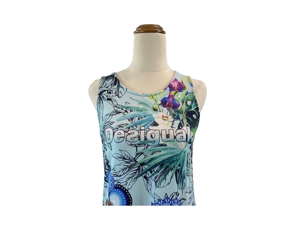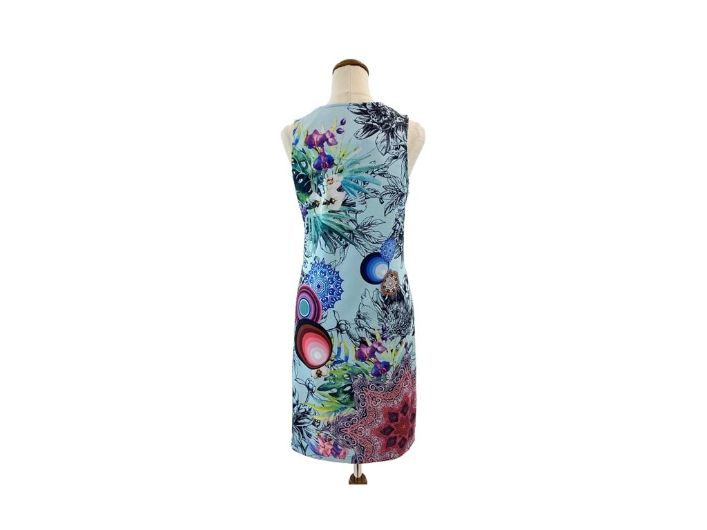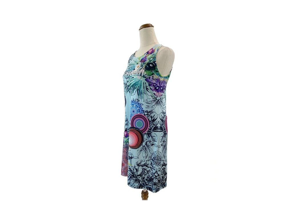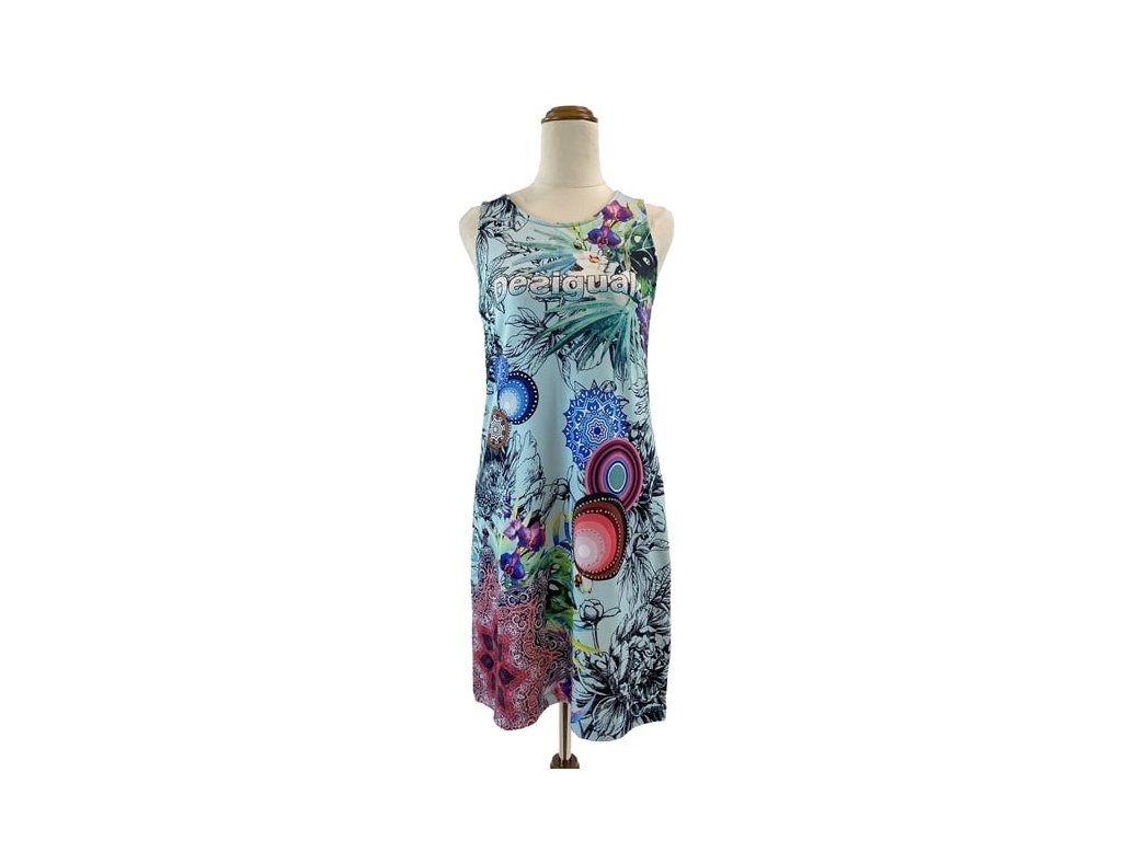 Stylové šaty Desigual vynikají výrazným barevným květinovým a geometrickým potiskem, který je pro tuto značku typický. Kombinace zelené a modré barvy vytváří živý a originální vzhled.