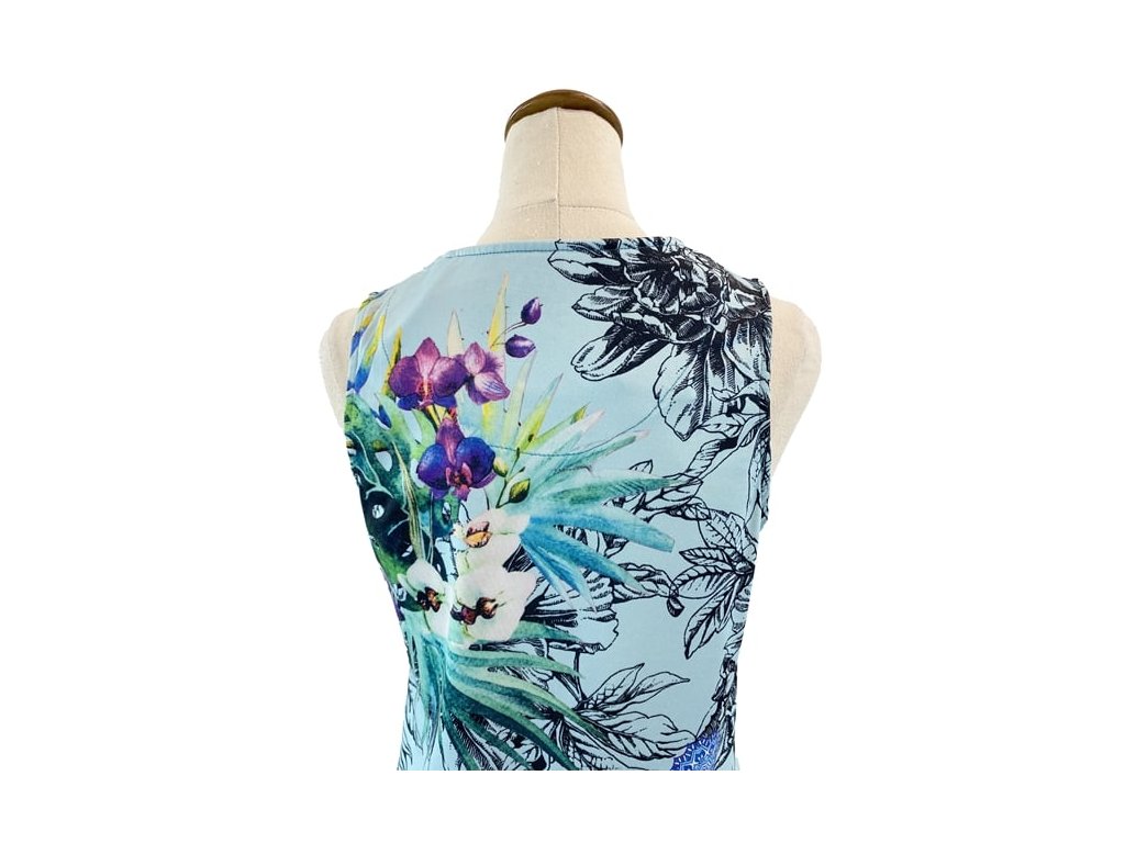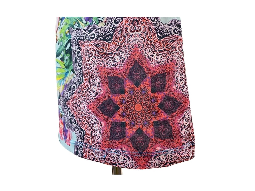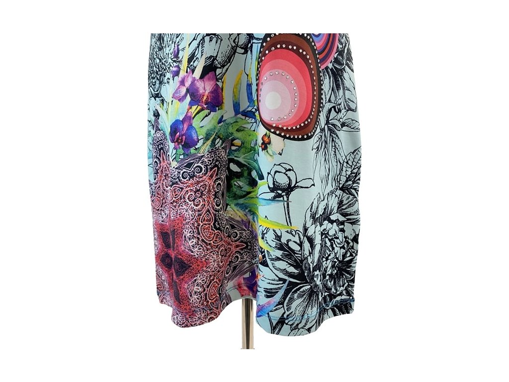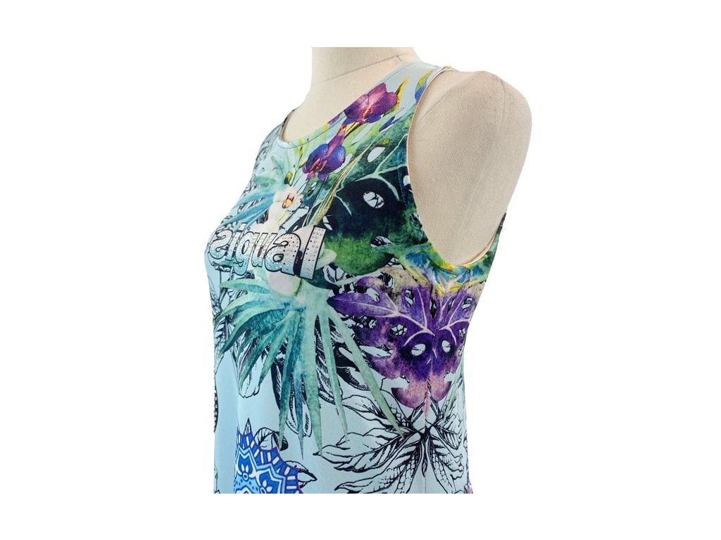 Stylové šaty Desigual vynikají výrazným barevným květinovým a geometrickým potiskem, který je pro tuto značku typický. Kombinace zelené a modré barvy vytváří živý a originální vzhled.