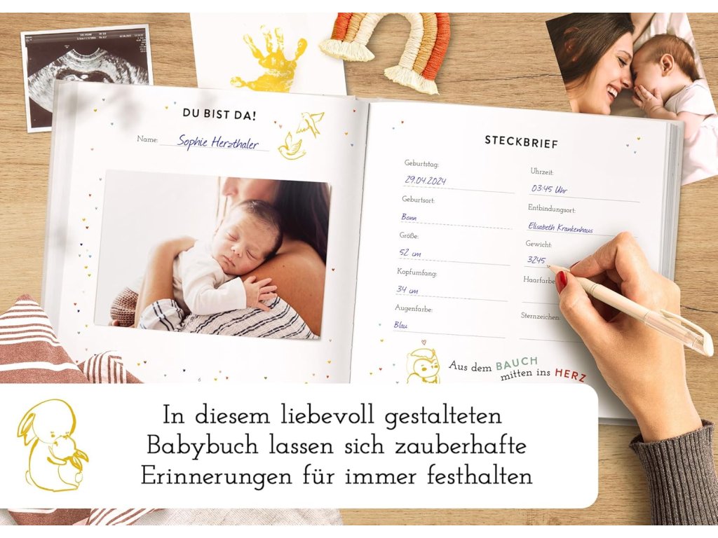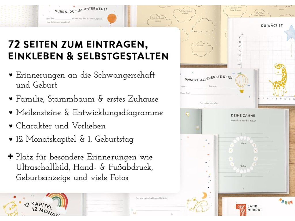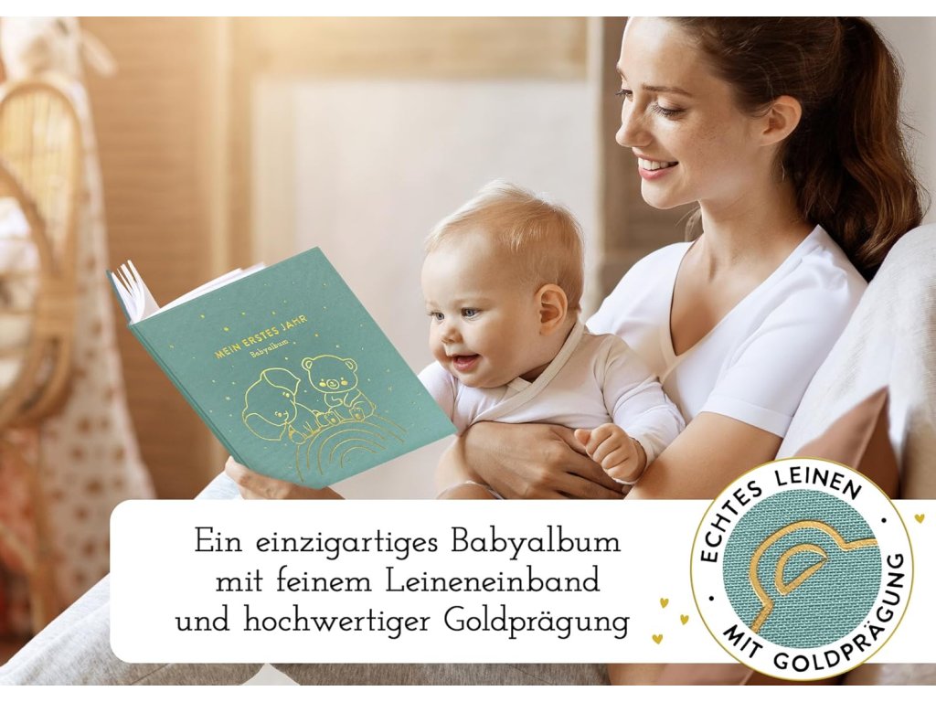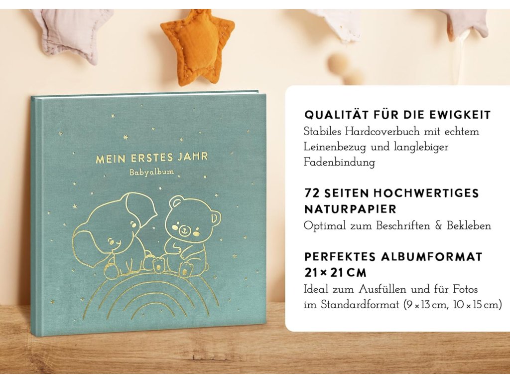 Tohle album je perfektní na zachycení všech těch úžasných prvních momentů s miminkem! Má pevnou vazbu a obálku potaženou lnem, takže vydrží opravdu dlouho. Na 72 stranách je spousta místa na fotky, na zapisování různých událostí a milníků z prvního roku života tvého děťátka. Je tam místo i na tvoji kreativitu, takže si album můžeš ozdobit podle sebe. Motiv duhy v mátové barvě a zlaté detaily vypadají moc hezky a hodí se pro holčičku i pro chlapečka. Je to skvělý dárek pro nastávající rodiče, ať už k narození miminka, k těhotenství nebo na oslavu baby shower.