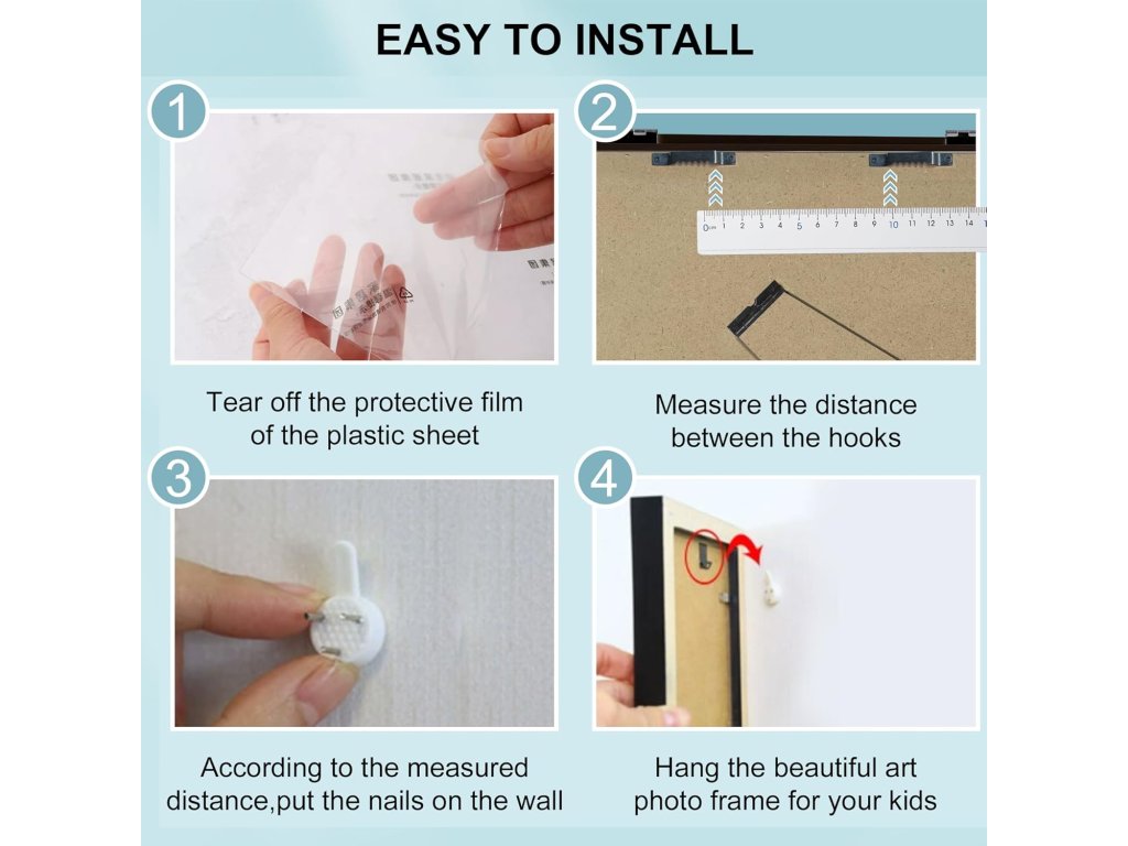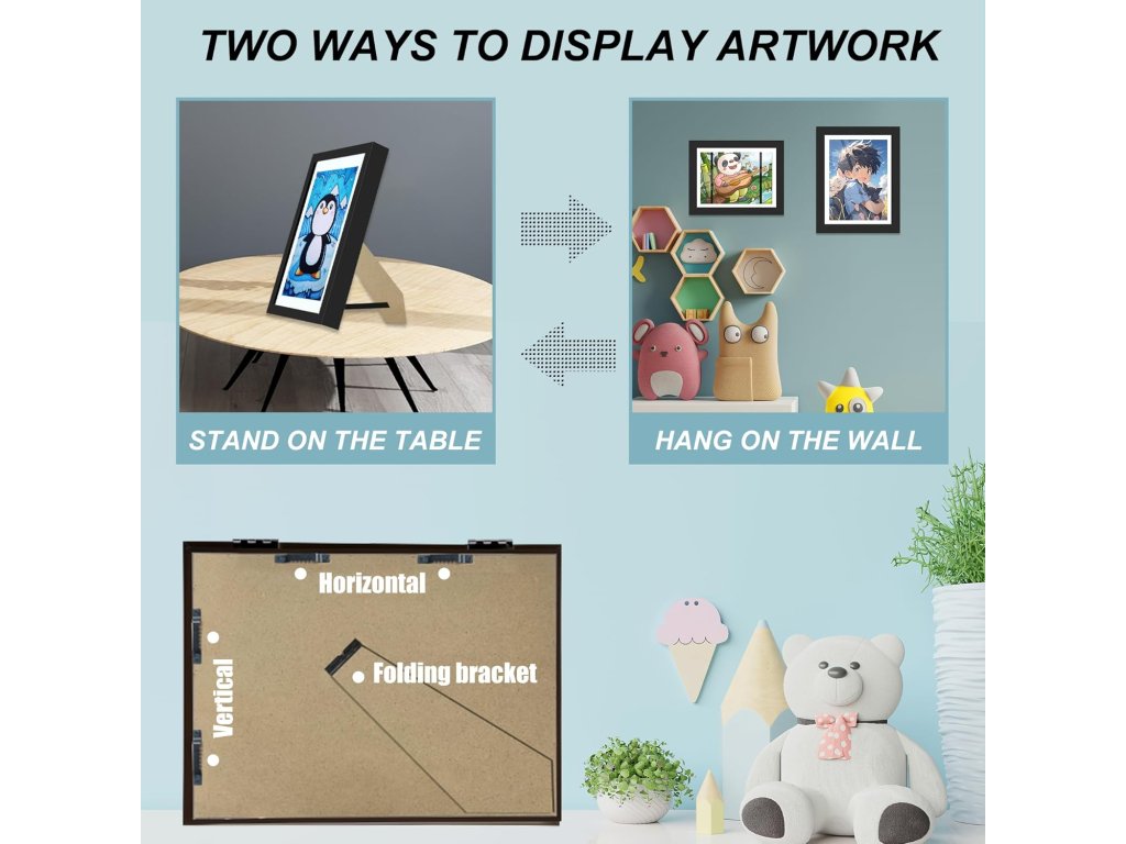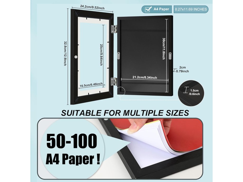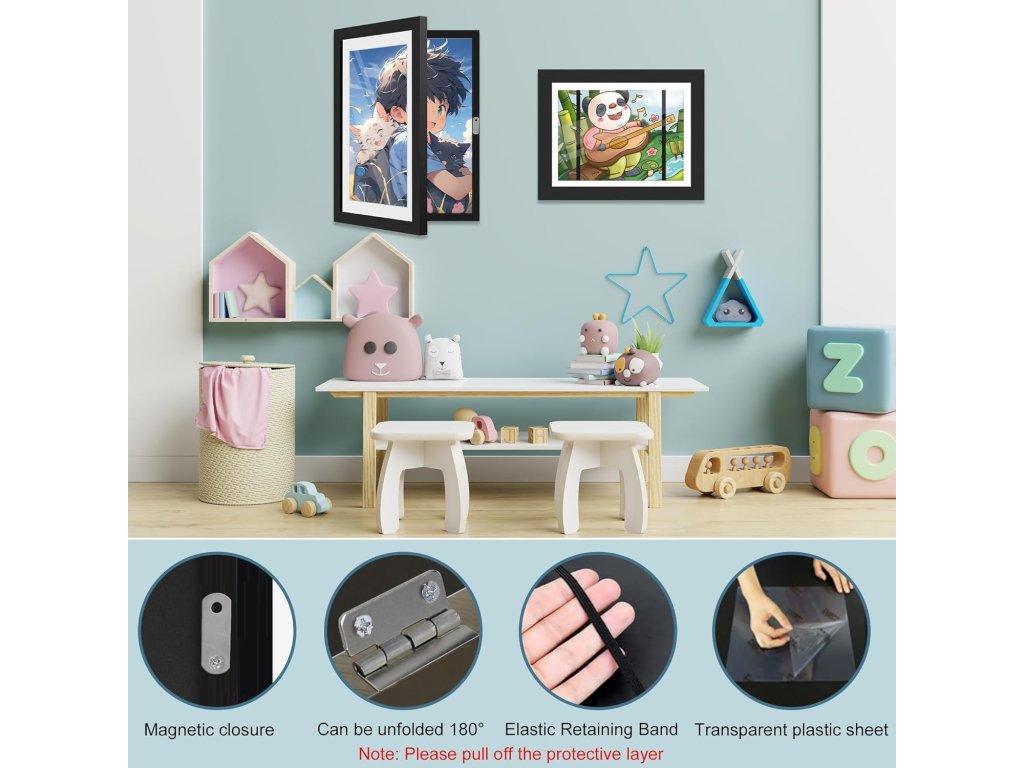 Tato sada dvou černých rámečků je ideální pro vystavení dětských uměleckých děl formátu A4 nebo menších. Rámečky jsou hluboké 1,5 cm a pojmou až 50-100 obrázků. Můžete je postavit na stůl vodorovně i svisle, nebo je pověsit na zeď. Díky magnetické sponě je výměna obrázků velmi snadná. Rámečky jsou vhodné nejen na dětské kresby, ale i na fotografie, diplomy a jiné ploché předměty.