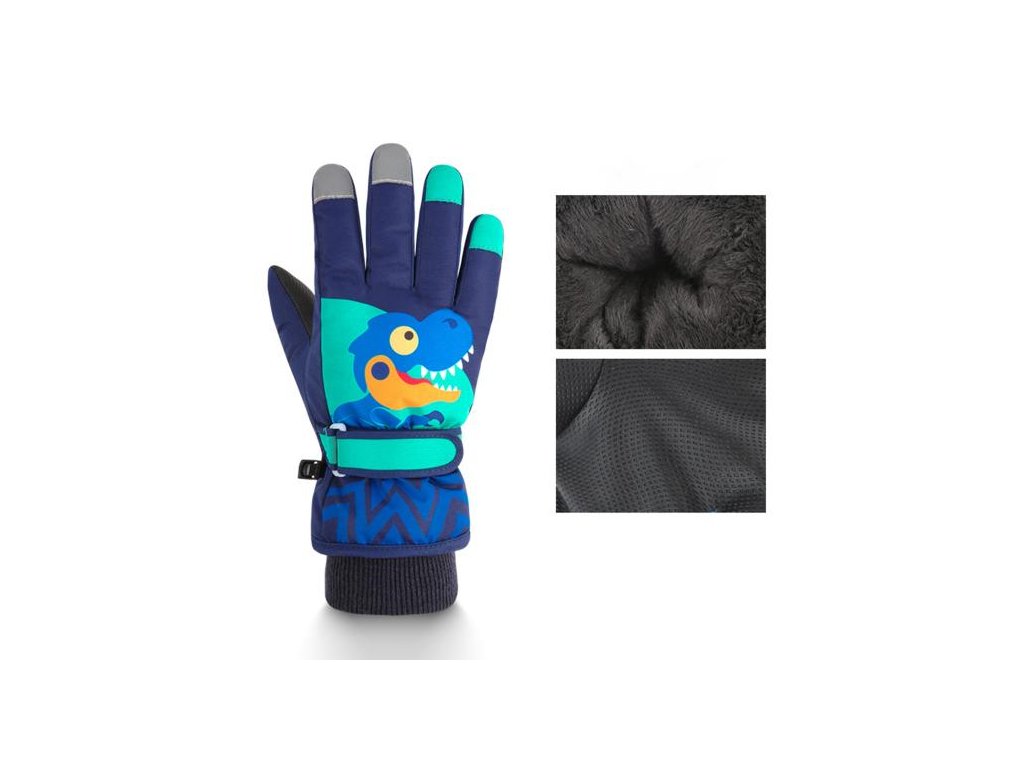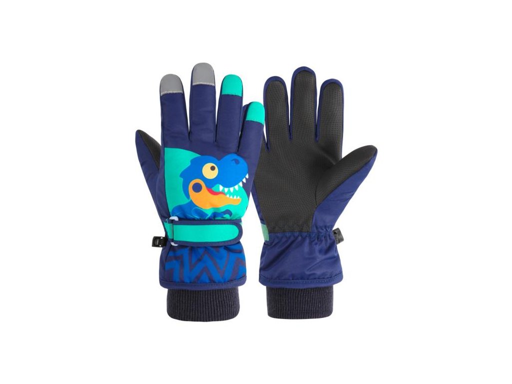 Dětské zimní rukavice XS (1-3 roky) s fleecovou podšívkou a kreslenými dinosaury. Voděodolné, protiskluzová dlaň, nastavitelný pásek na zápěstí. Ideální pro lyžování a zimní aktivity.
