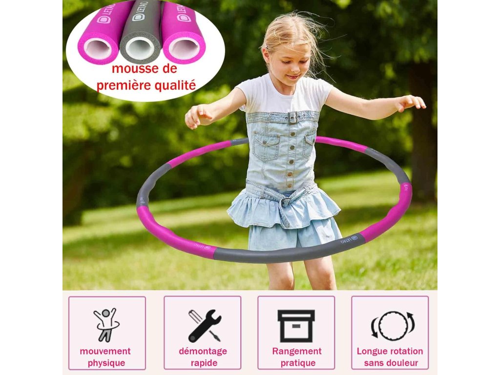 Dětský hula hoop LETAO v růžovo-šedé barvě je navržen pro děti ve věku 4 až 12 let. Váží 0,7 kg a je sestaven z 8 odnímatelných dílů, což umožňuje snadné nastavení velikosti. Díky vlnitému designu s 24 masážními body má navíc masážní a tvarovací účinek. Je vyroben z nového flexibilního materiálu, který je odolný proti zlomení.