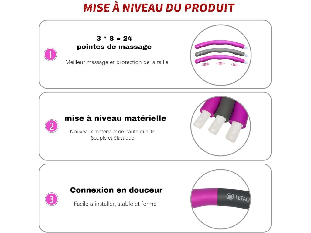 Hula hoop má vylepšený vlnitý design se třemi řadami masážních bodů na každém segmentu, což celkem tvoří 24 masážních bodů. Tyto body mají nejen masážní, ale i tvarovací účinek, který pomáhá při spalování tuku.