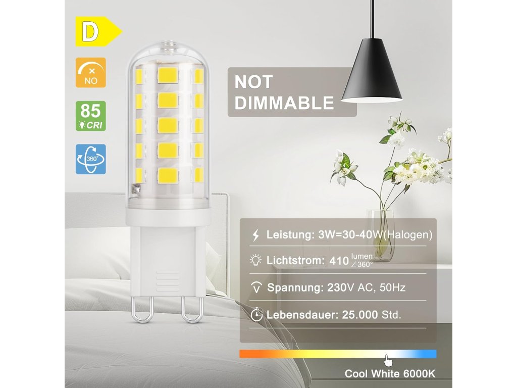 Tato sada šesti DiCUNO G9 LED žárovek s příkonem pouhých 3W efektivně nahrazuje 30W až 40W halogenové žárovky a poskytuje příjemné teplé bílé světlo s teplotou chromatičnosti 2700K a jasem 410 lumenů. Díky širokému úhlu vyzařování 360° a vysokému indexu podání barev (CRI 85) věrně reprodukuje barvy a vytváří útulnou atmosféru. Tyto energeticky úsporné žárovky snižují spotřebu energie až o 92,5 % a mají dlouhou životnost až 25 000 hodin, čímž šetří náklady na elektřinu i výměnu žárovek. Jsou navrženy bez blikání a stroboskopického efektu, čímž chrání vaše oči. Kompaktní rozměry (50 mm x 15,4 mm, rozteč pinů 9 mm) umožňují snadnou instalaci do většiny objímek G9, i do menších svítidel. Po zapnutí okamžitě dosahují plného jasu bez čekání a vyznačují se dobrým odvodem tepla. Jsou ideální pro použití v lustrech, stropních svítidlech, stolních lampách, nástěnných svítidlech a osvětlení zrcadel v obývacích pokojích, kuchyních, jídelnách a koupelnách. Upozornění: Tyto LED žárovky nejsou stmívatelné a neměly by být používány se stmívači. Energetická třída D.