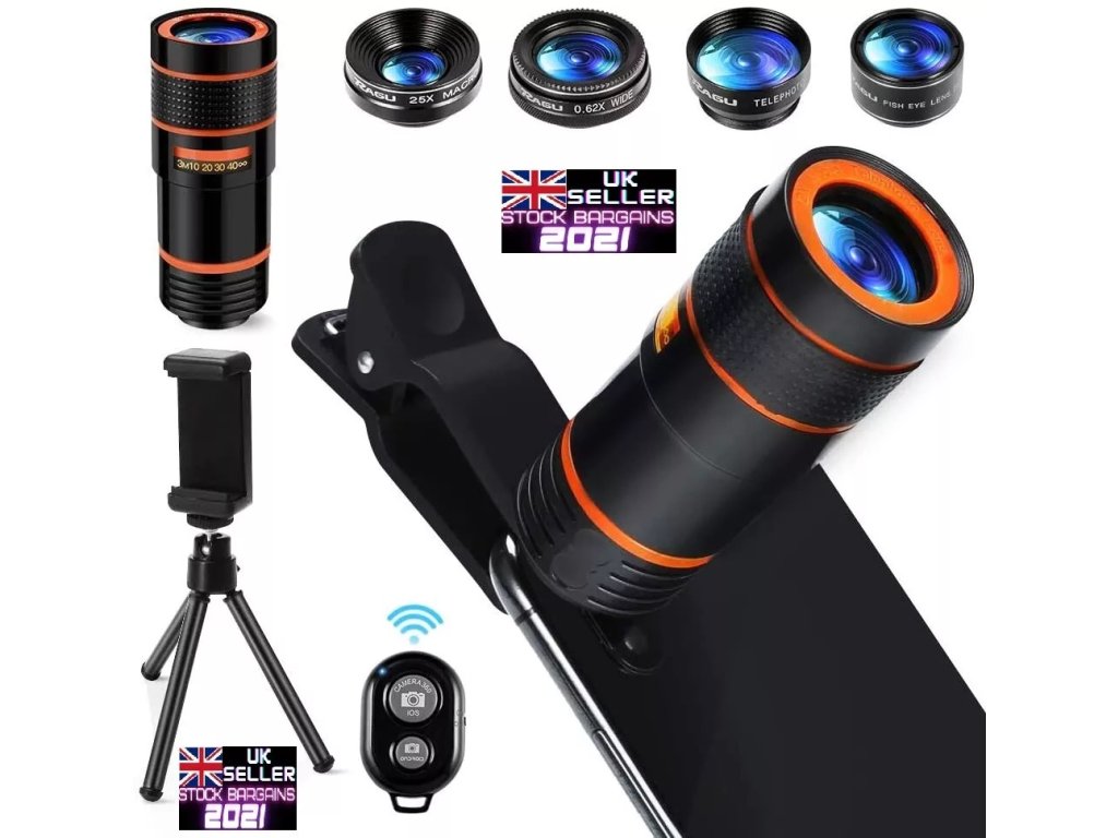 Distianert 6 v 1 univerzální sada objektivů pro mobilní telefony (N166) promění váš smartphone ve výkonný fotoaparát. Obsahuje 0,62x širokoúhlý objektiv, 25x makro objektiv, 235° rybí oko, držák na telefon, dálkovou spoušť a stativ. Sada je kompatibilní s většinou chytrých telefonů, včetně iPhone X/8/7/6/6s Plus a Samsung Android.