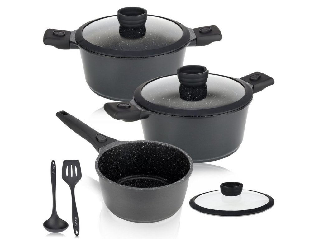 Divory sada hrnců s odnímatelnými uchy - 8dílná pro všestranné vaření: Objevte vysoce kvalitní a praktickou sadu hrnců Divory, která přináší revoluci do vaší kuchyně. Tato 8dílná sada obsahuje rendlík o průměru 18 cm, hrnec o průměru 20 cm a hrnec o průměru 24 cm, vše vyrobeno z odolného hliníku. Klíčovou vlastností těchto hrnců jsou odnímatelná držadla, která usnadňují manipulaci, skladování a čištění.